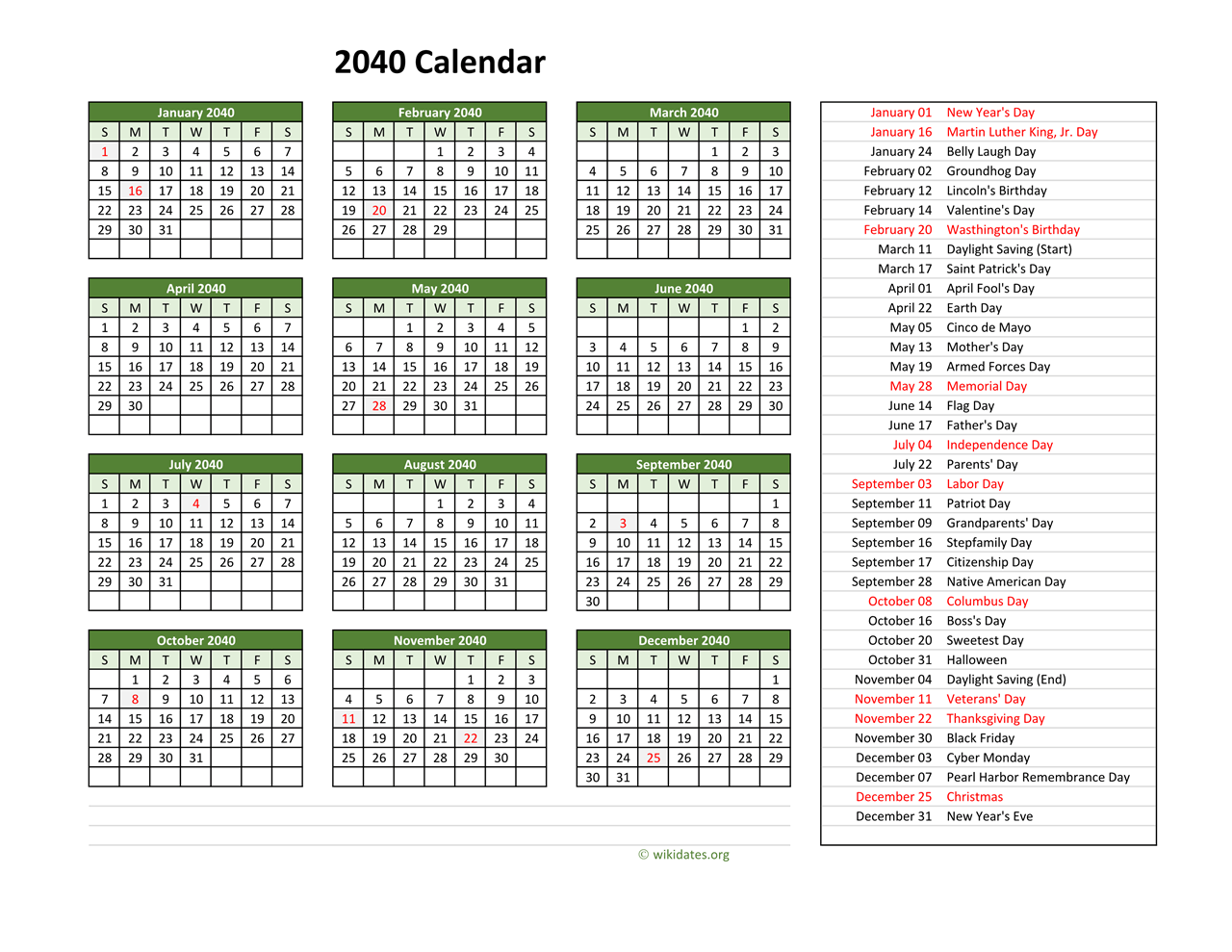 2040 Calendar with US Holidays