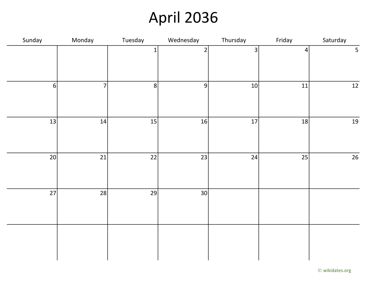 April 2036 Calendar with Bigger boxes make it easier to write in and scan your schedule. You can print full-page calendar with US holidays, week starts on Sunday, landscape/horizontal orientation.