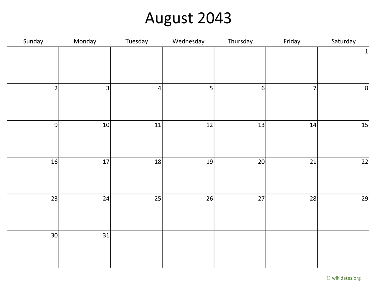 August 2043 Calendar with Bigger boxes make it easier to write in and scan your schedule. You can print full-page calendar with US holidays, week starts on Sunday, landscape/horizontal orientation.