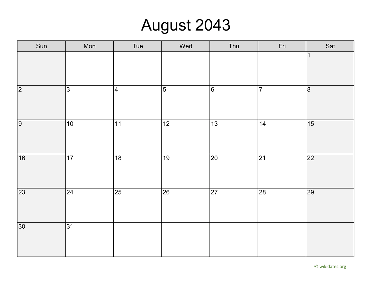 August 2043 Calendar with Saturday and Sunday are shaded in light gray, this template lets you include your schedule, events, notes, to-do list and holidays.