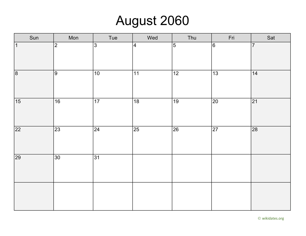 August 2060 Calendar with Saturday and Sunday are shaded in light gray, this template lets you include your schedule, events, notes, to-do list and holidays.