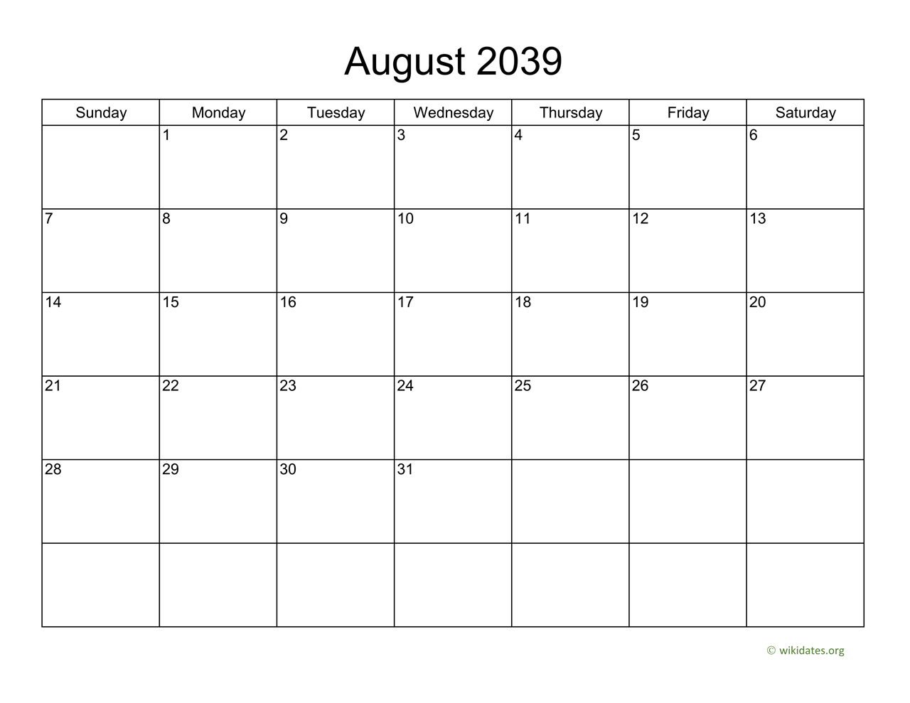 This is a basic, full-page monthly calendar for august 2039. You can download or print august 2039 calendar with your schedule, events and federal holidays included.
