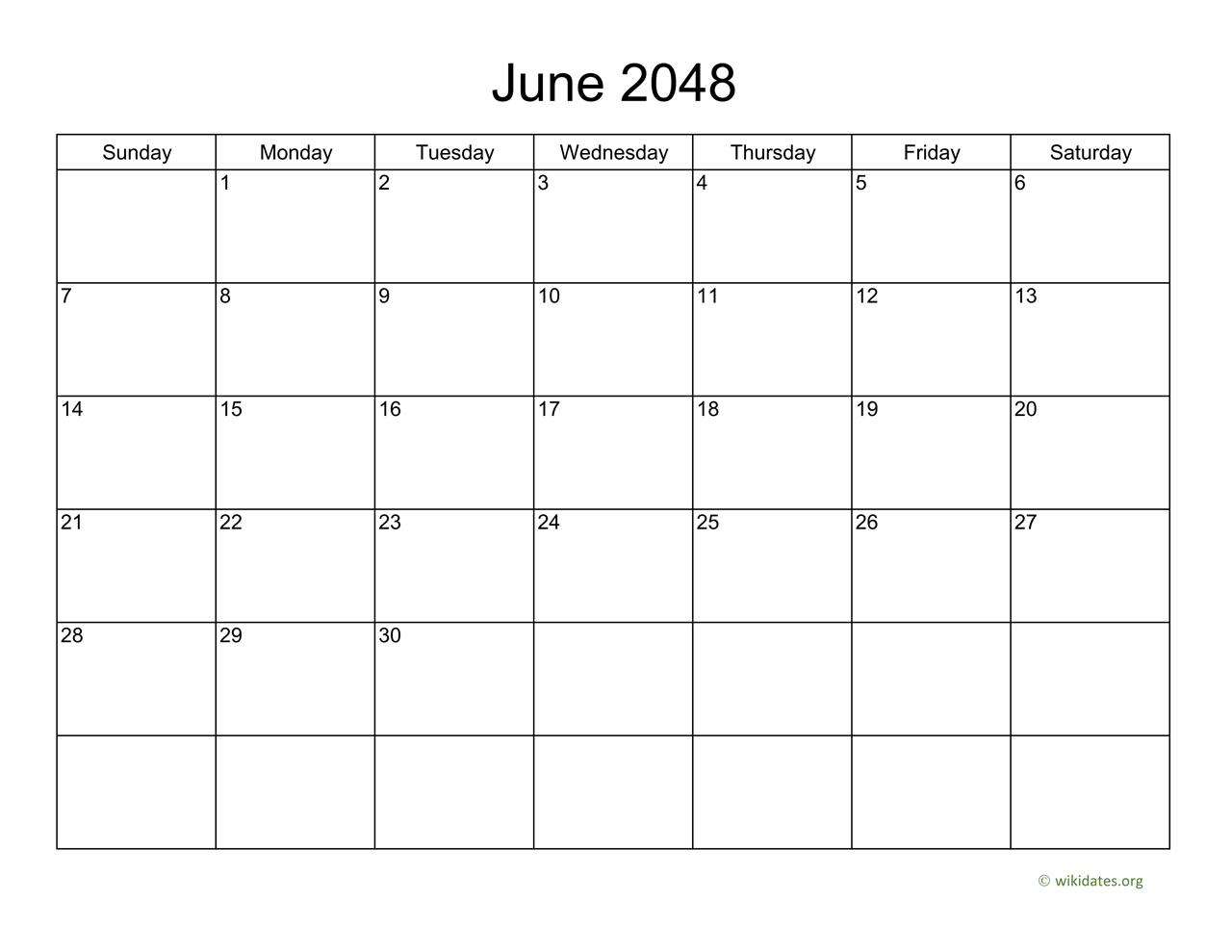 This is a basic, full-page monthly calendar for june 2048. You can download or print june 2048 calendar with your schedule, events and federal holidays included.