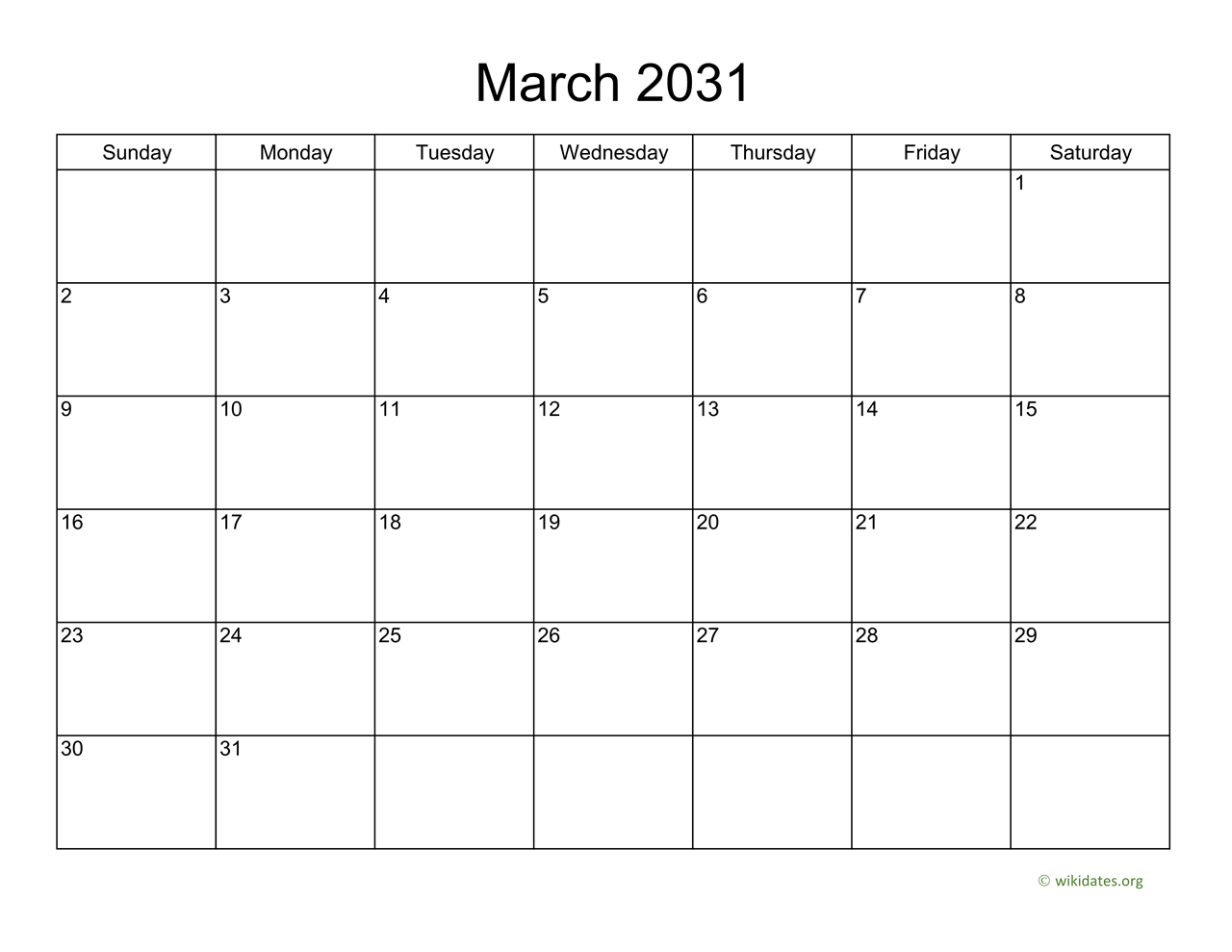 This is a basic, full-page monthly calendar for march 2031. You can download or print march 2031 calendar with your schedule, events and federal holidays included.