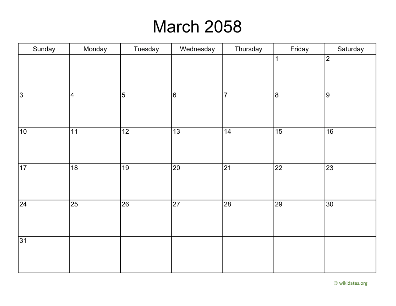 This is a basic, full-page monthly calendar for march 2058. You can download or print march 2058 calendar with your schedule, events and federal holidays included.