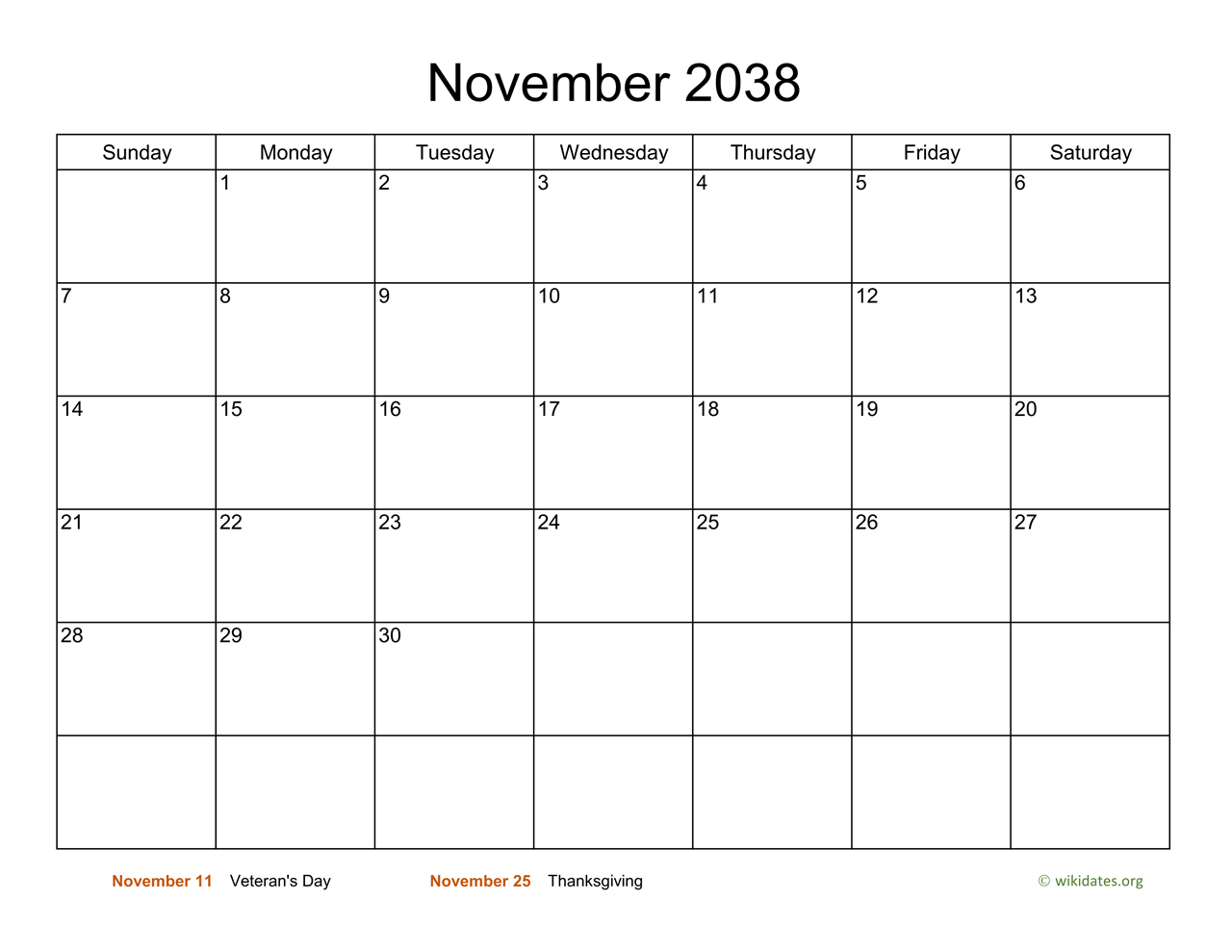 This is a basic, full-page monthly calendar for november 2038. You can download or print november 2038 calendar with your schedule, events and federal holidays included.