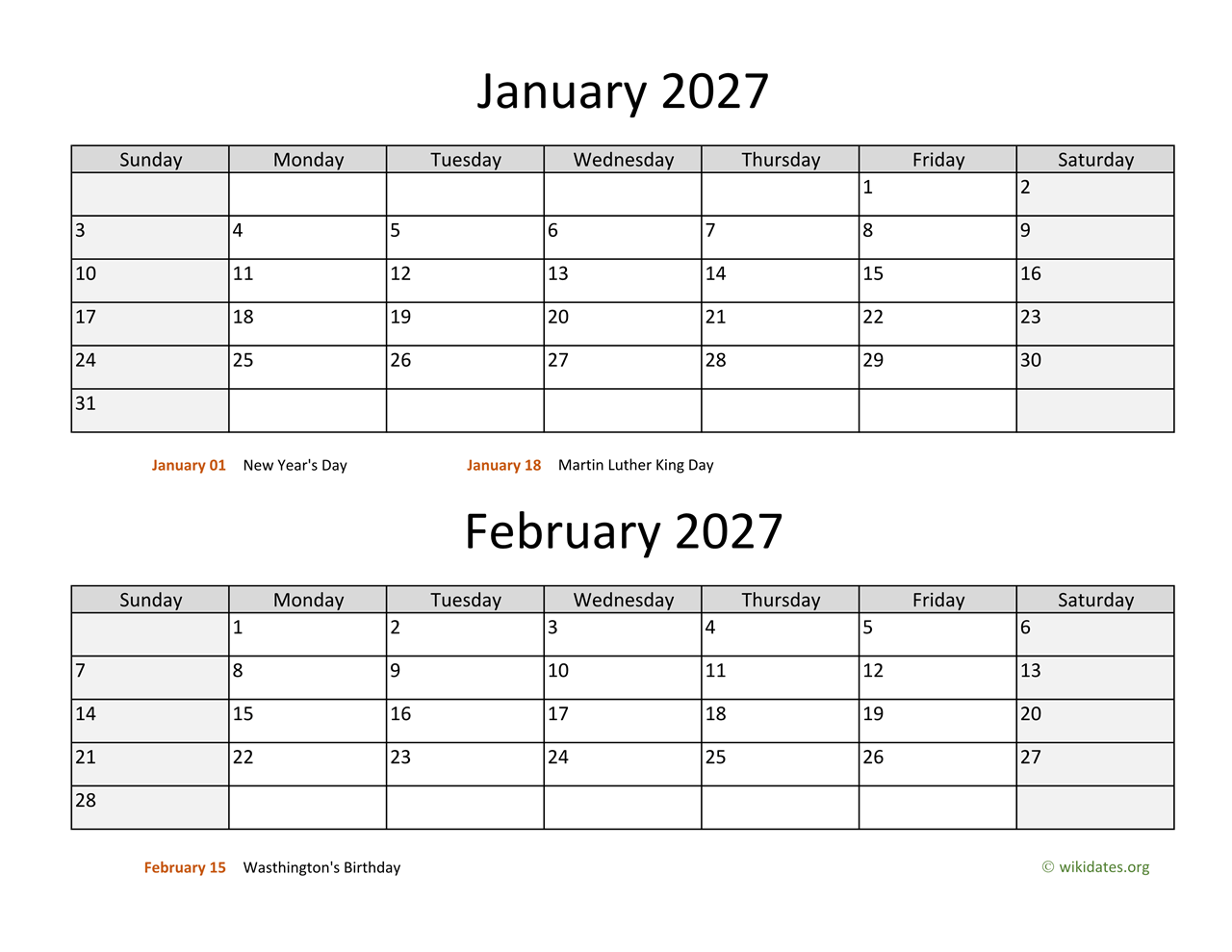 • Printable Bi-Monthly 2027 Calendar. Two months calendar for 2027 including Federal holidays as PDF (Adobe Reader PDF) in US letter paper format.