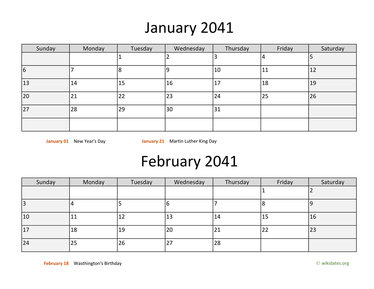 • Printable Bi-Monthly 2041 Calendar. Two months calendar for 2041 including Federal holidays as PDF (Adobe Reader PDF) in US letter paper format.