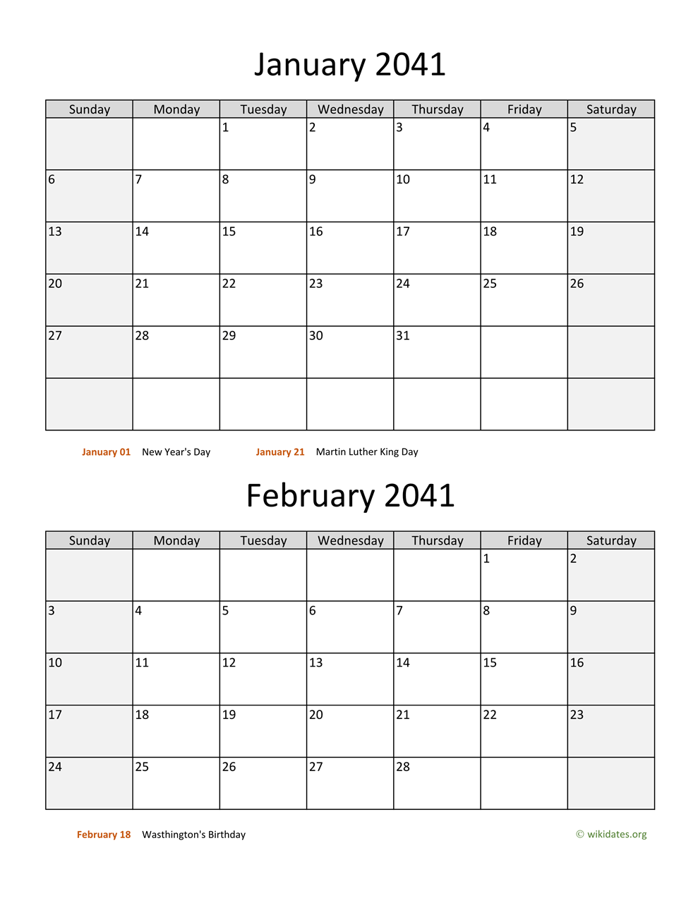 Two months 2041 calendar with space for Notes, available in PDF file, letter paper size, vertical/portrait format.