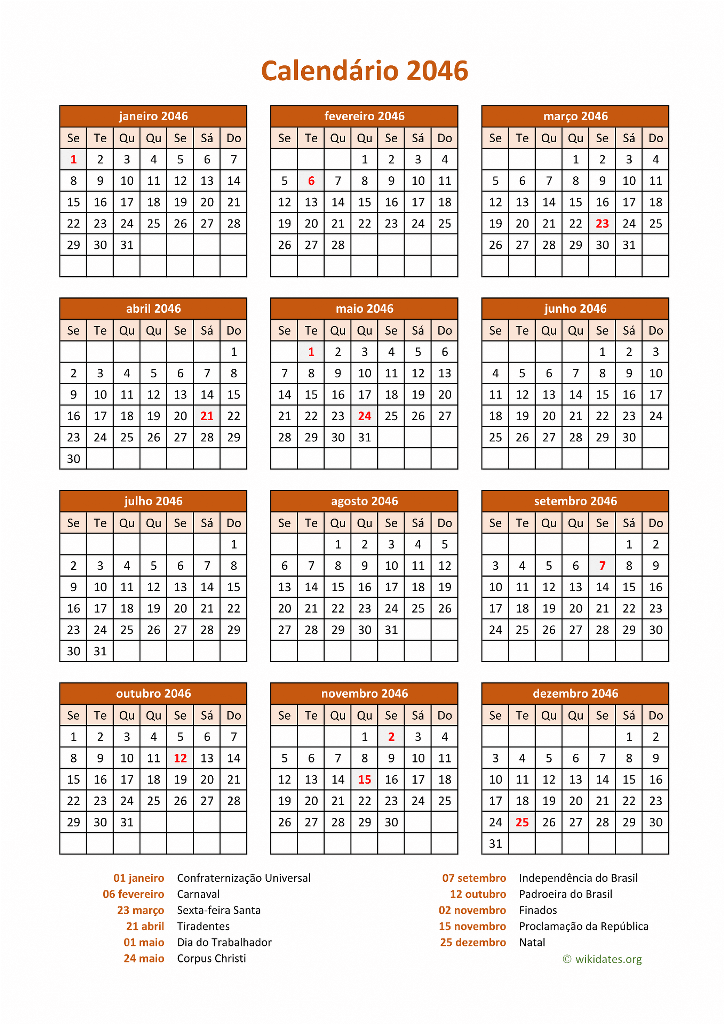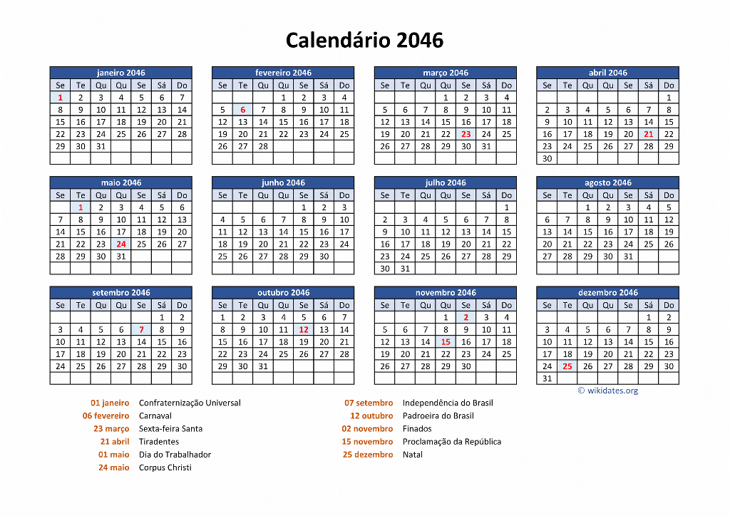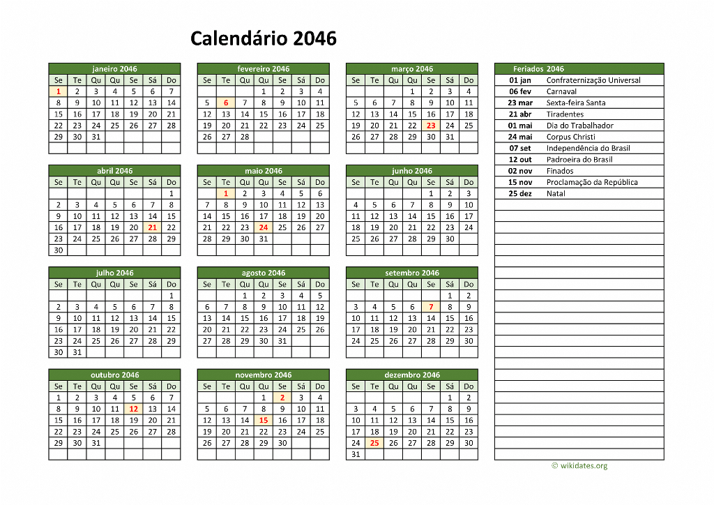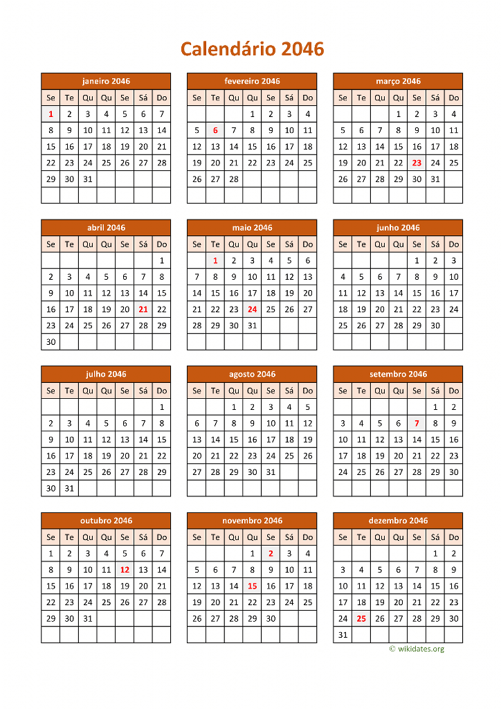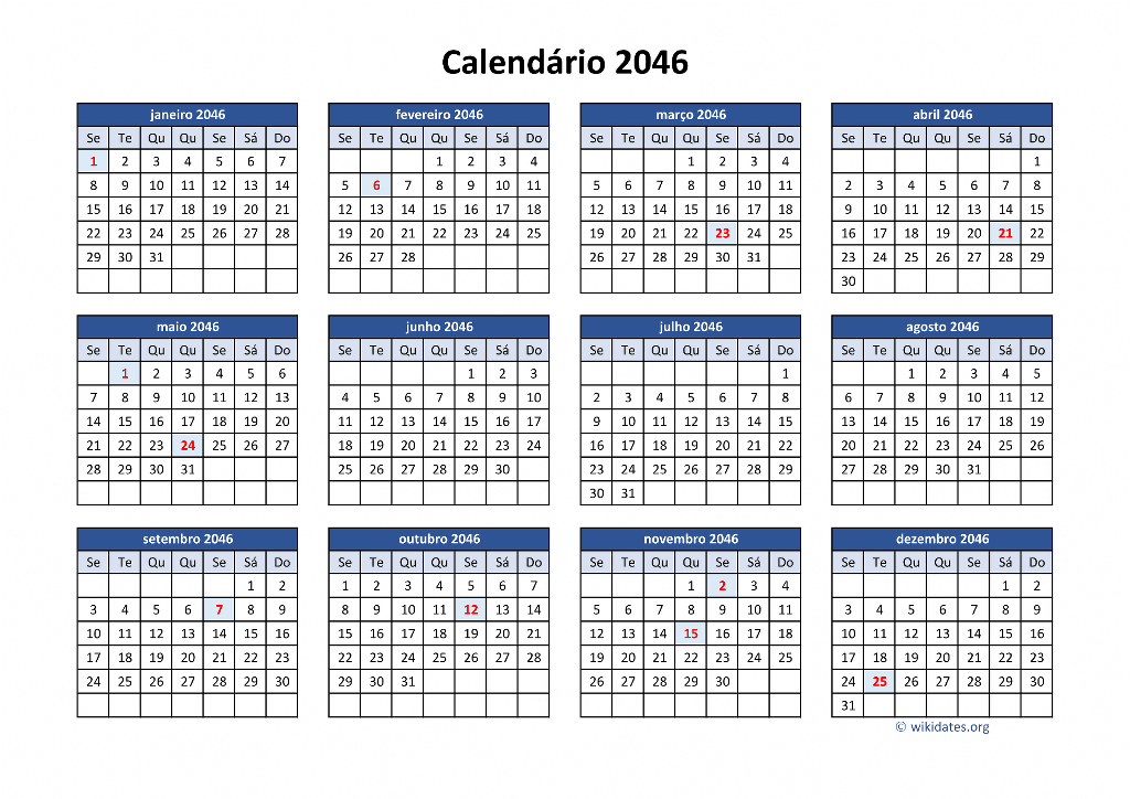 • Calendários mensais de 2046 (gratuito e de impressão) por 12 meses a 12 páginas (um mês por página), com feriados e número da semana (semana começa na segunda-feira).