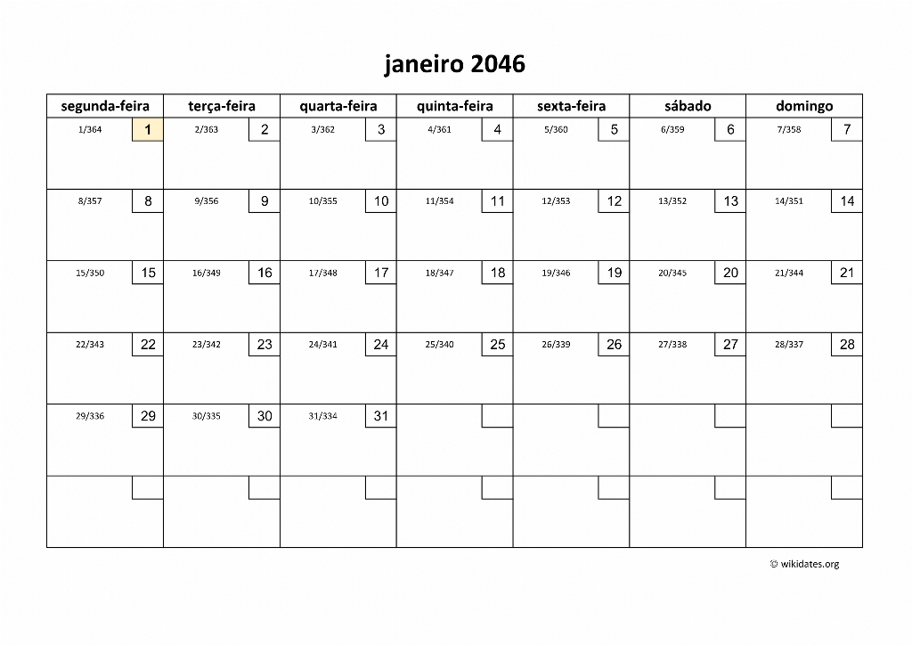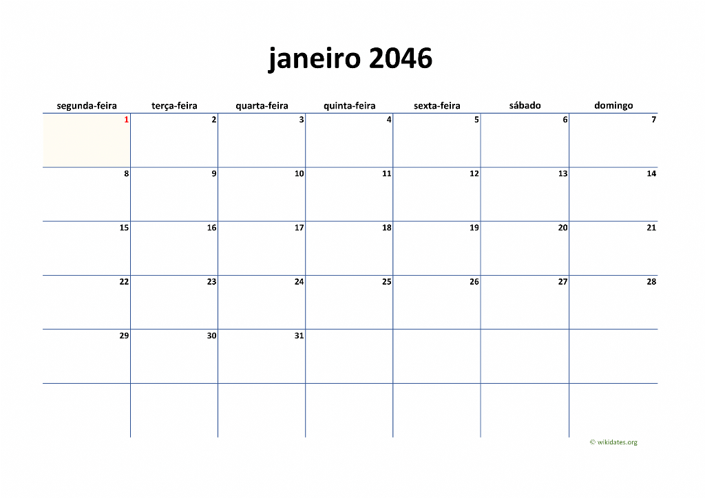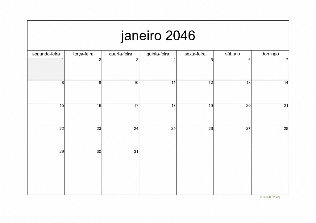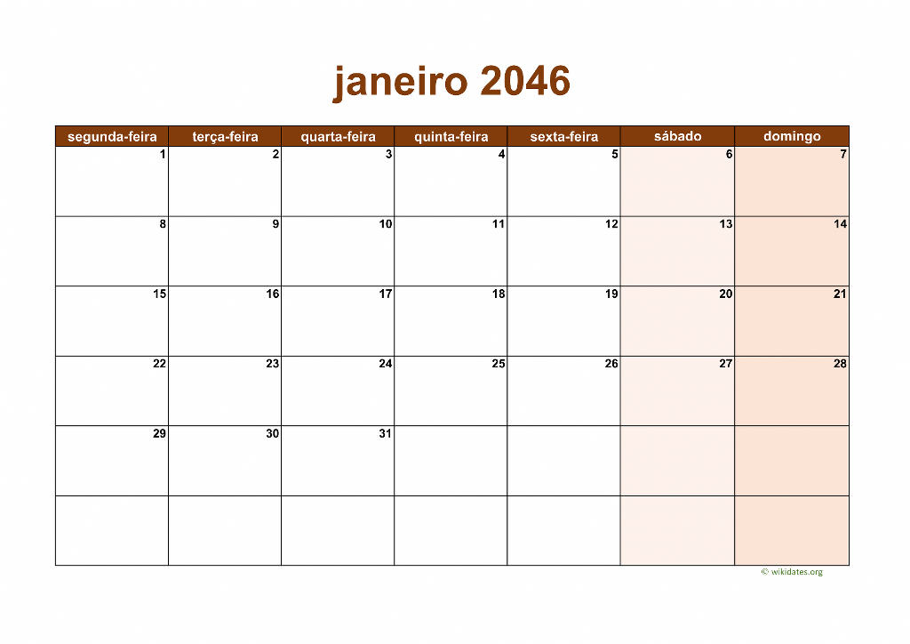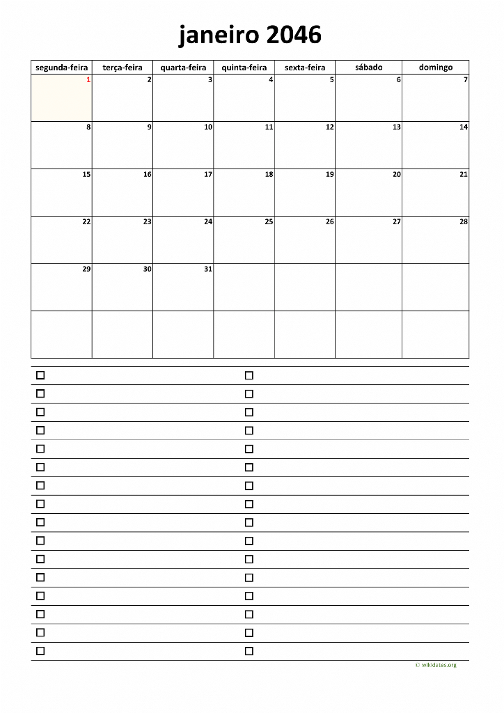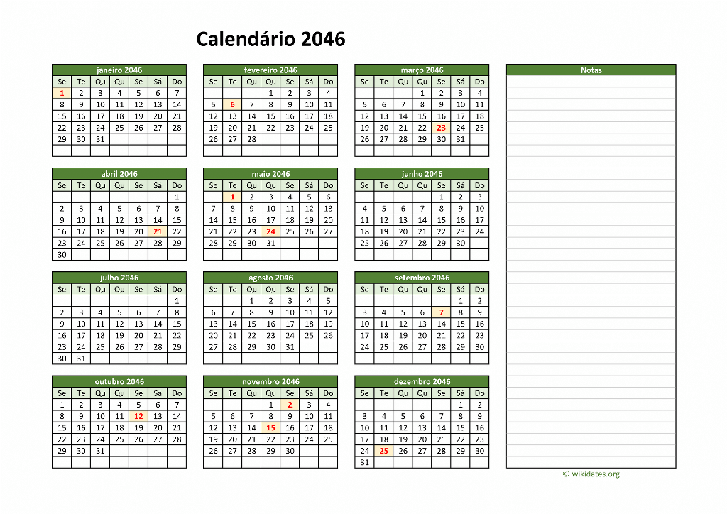 • Calendários mensais de 2046 (gratuito e de impressão) por 12 meses a 12 páginas (um mês por página), com feriados e número da semana (semana começa na segunda-feira).