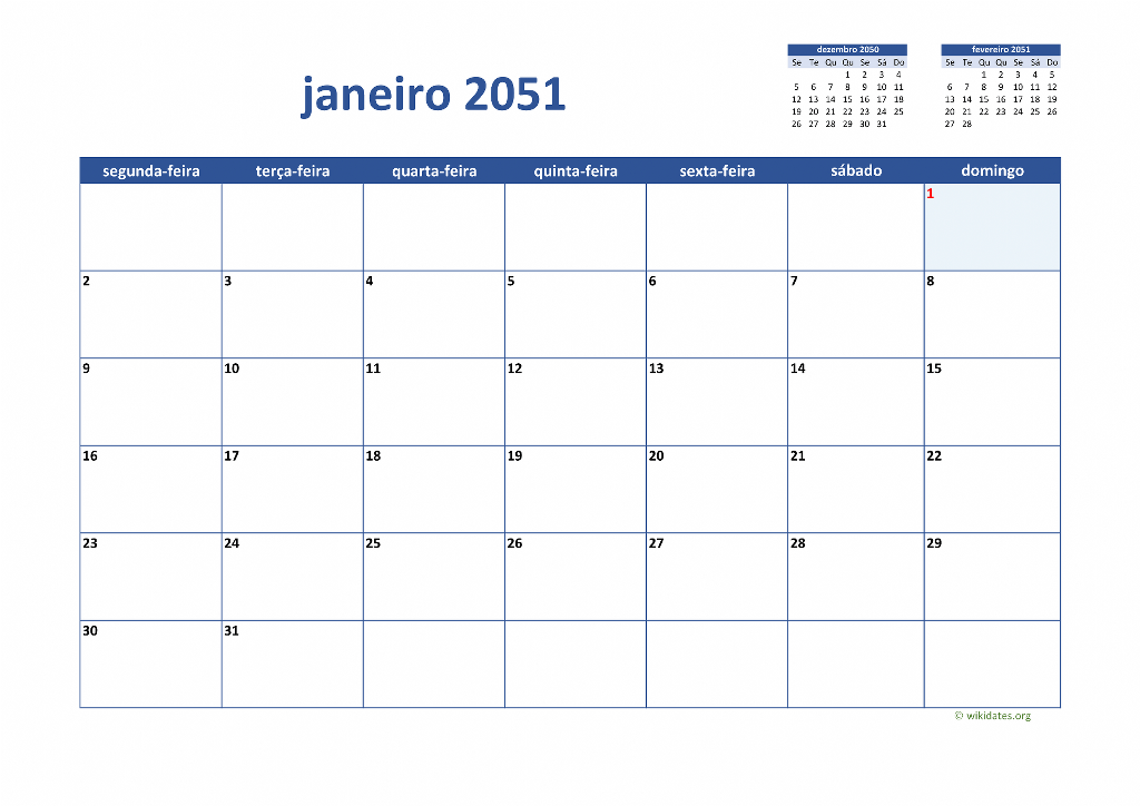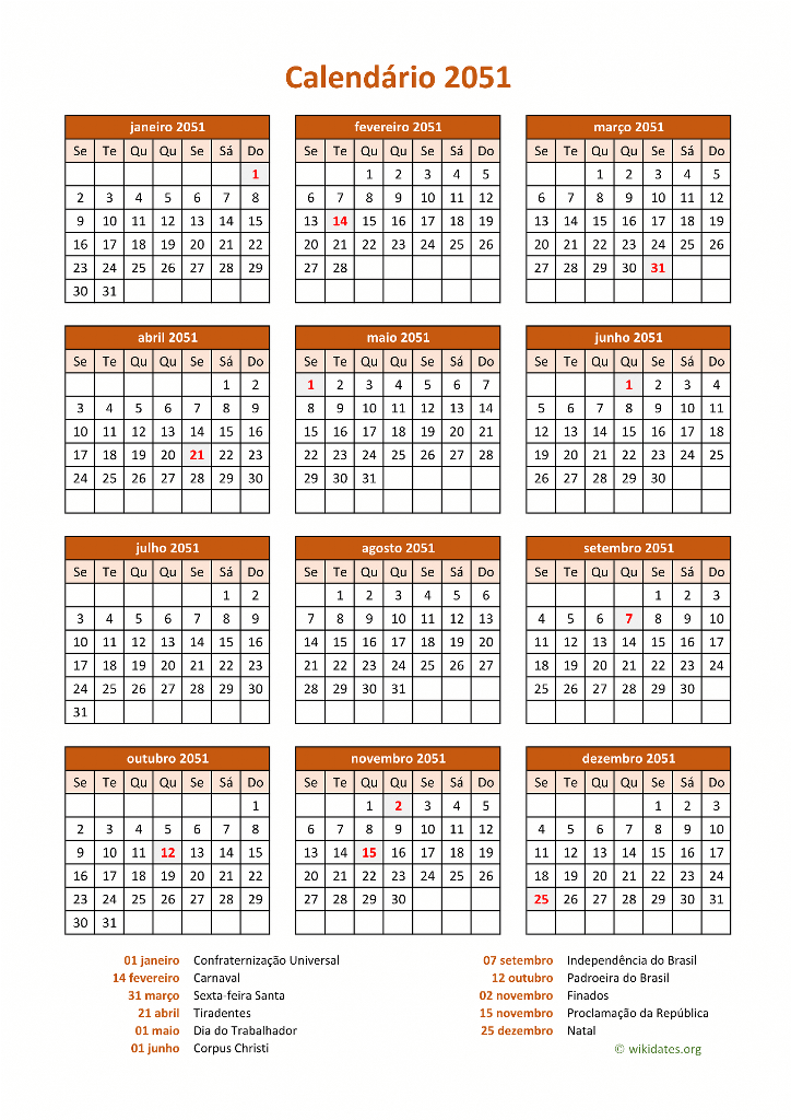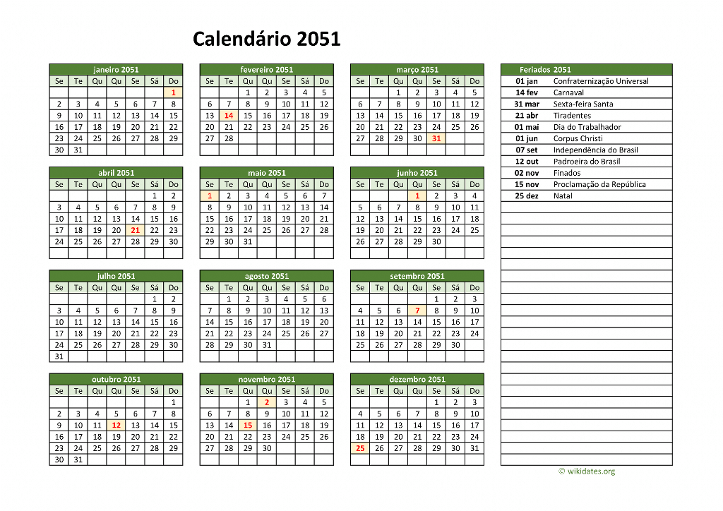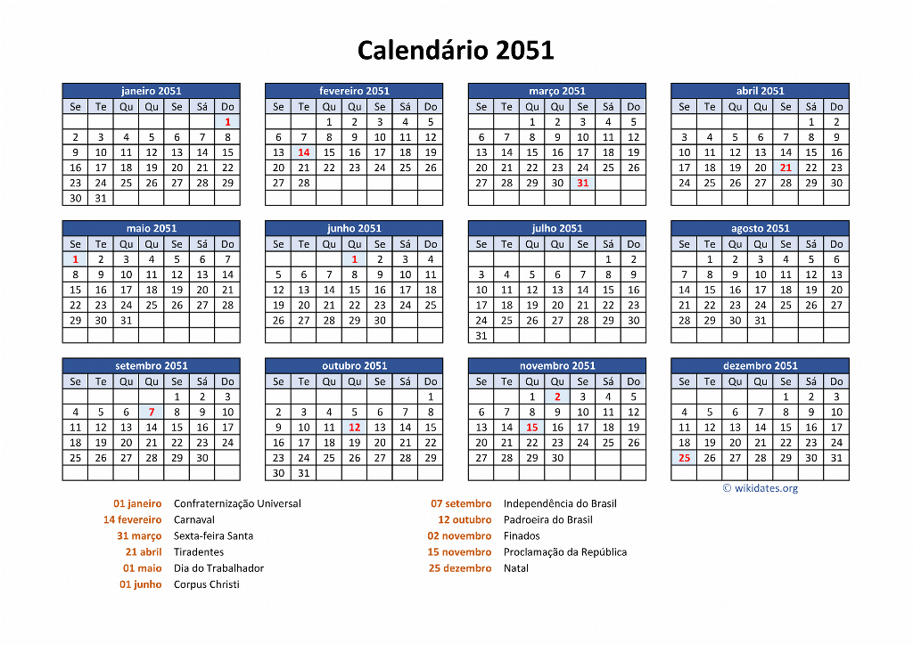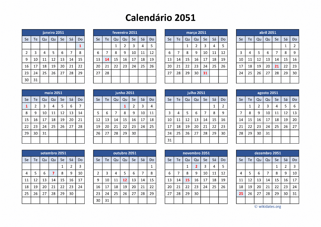 • Calendários mensais de 2051 (gratuito e de impressão) por 12 meses a 12 páginas (um mês por página), com feriados e número da semana (semana começa na segunda-feira).