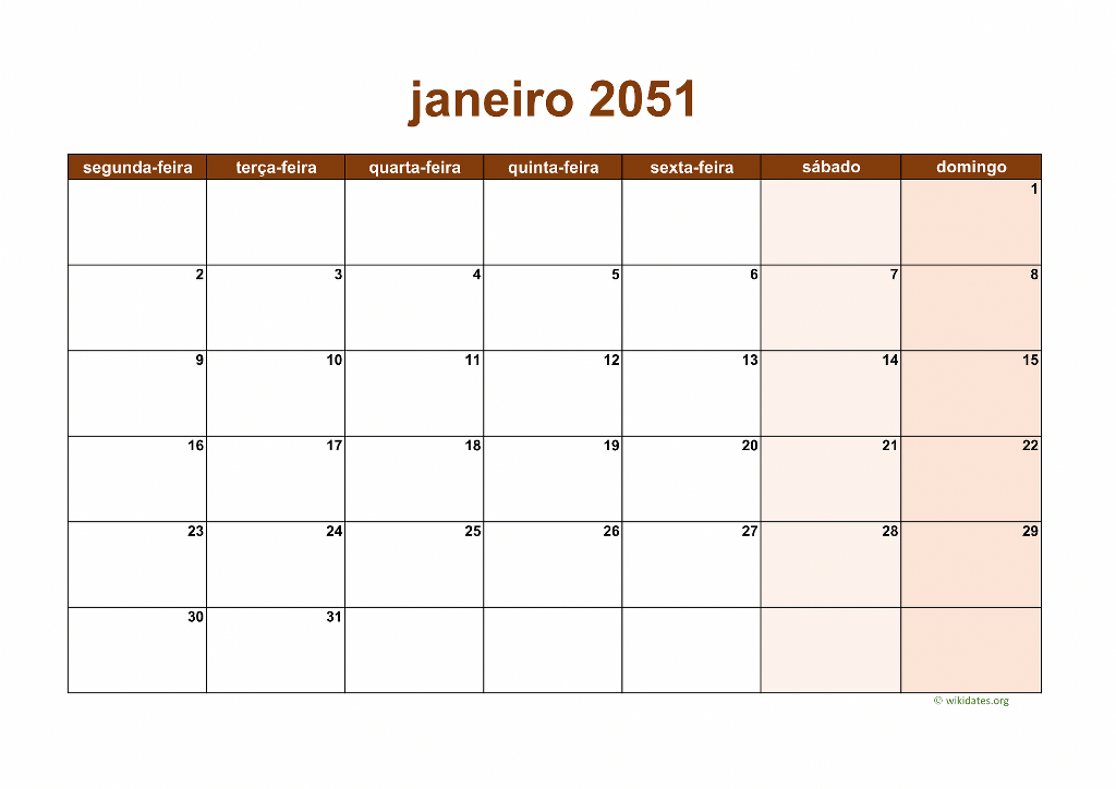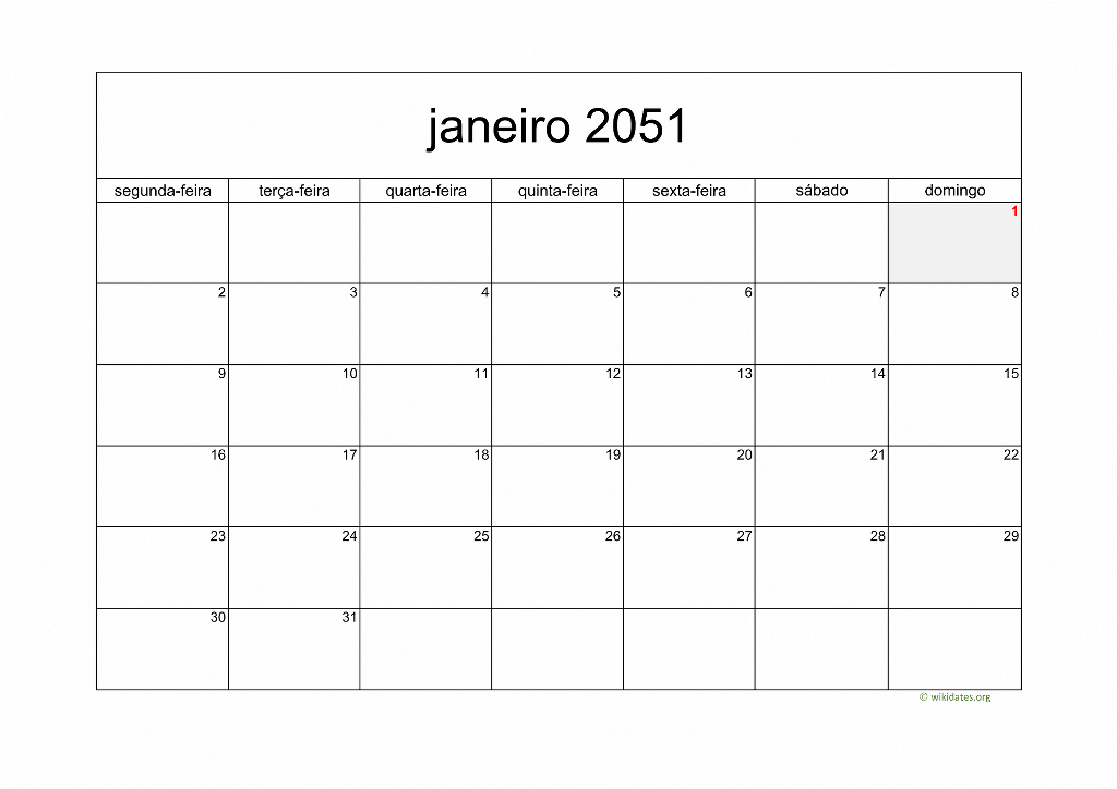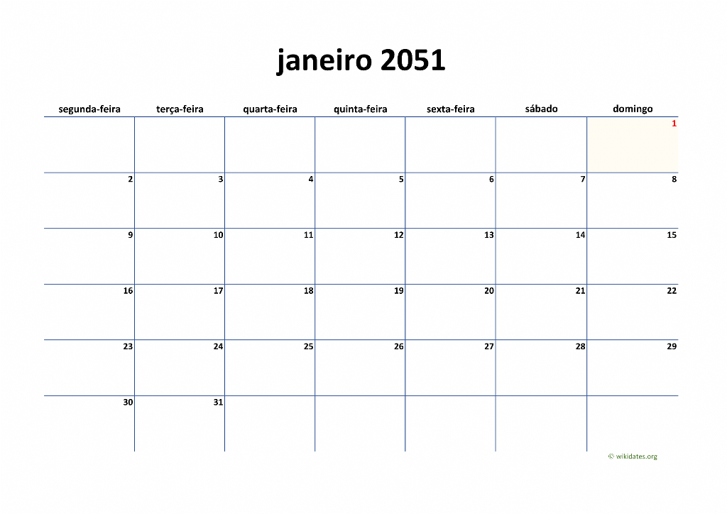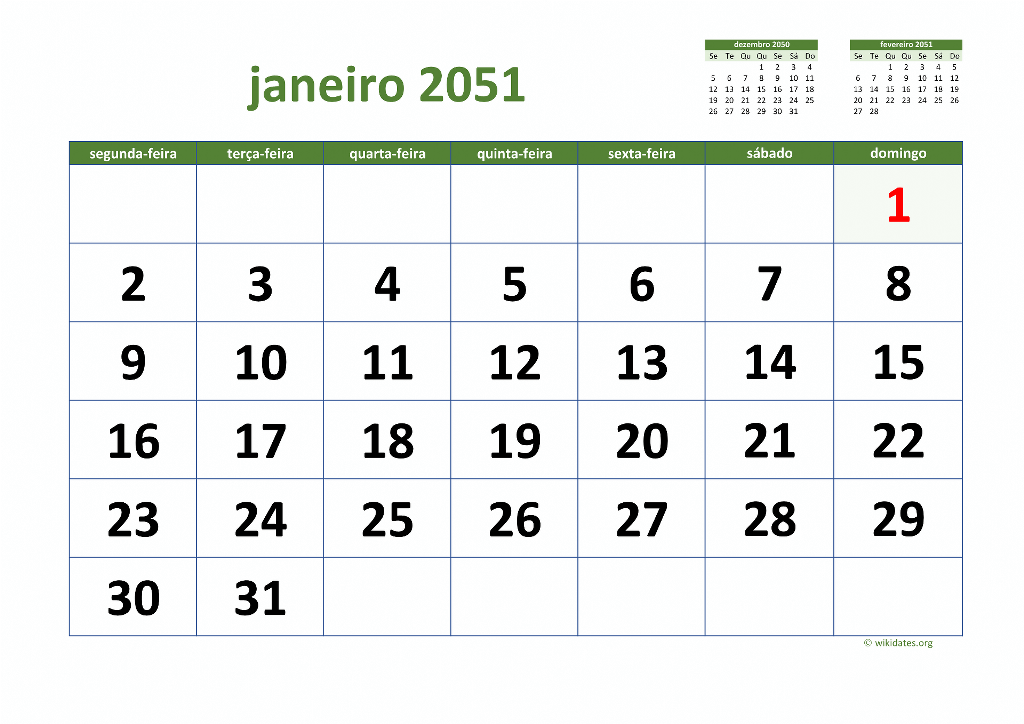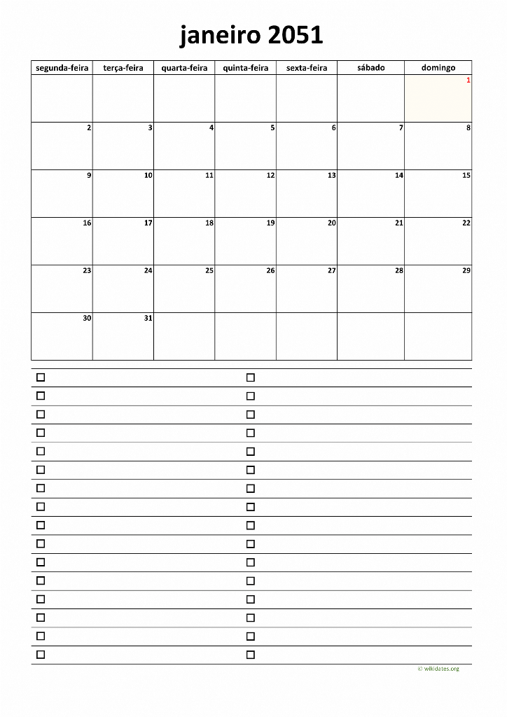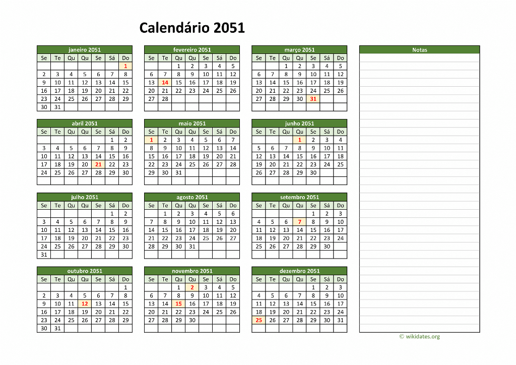 • Calendários mensais de 2051 (gratuito e de impressão) por 12 meses a 12 páginas (um mês por página), com feriados e número da semana (semana começa na segunda-feira).
