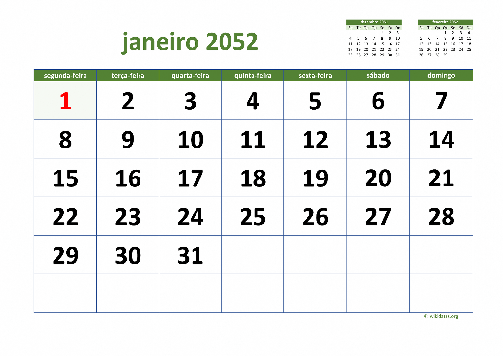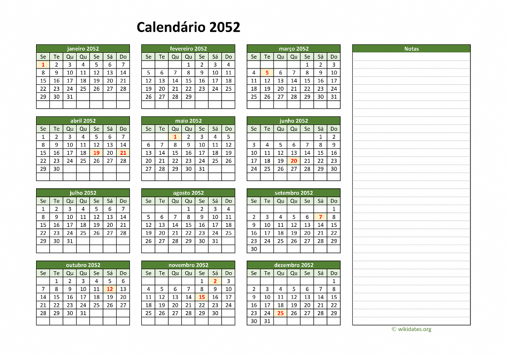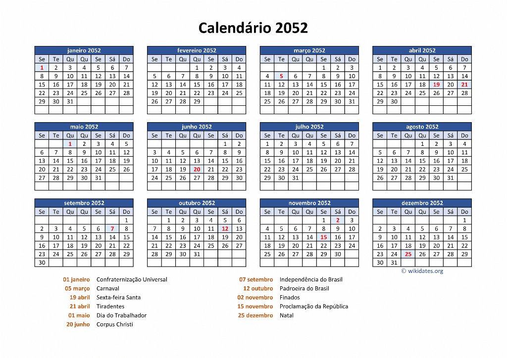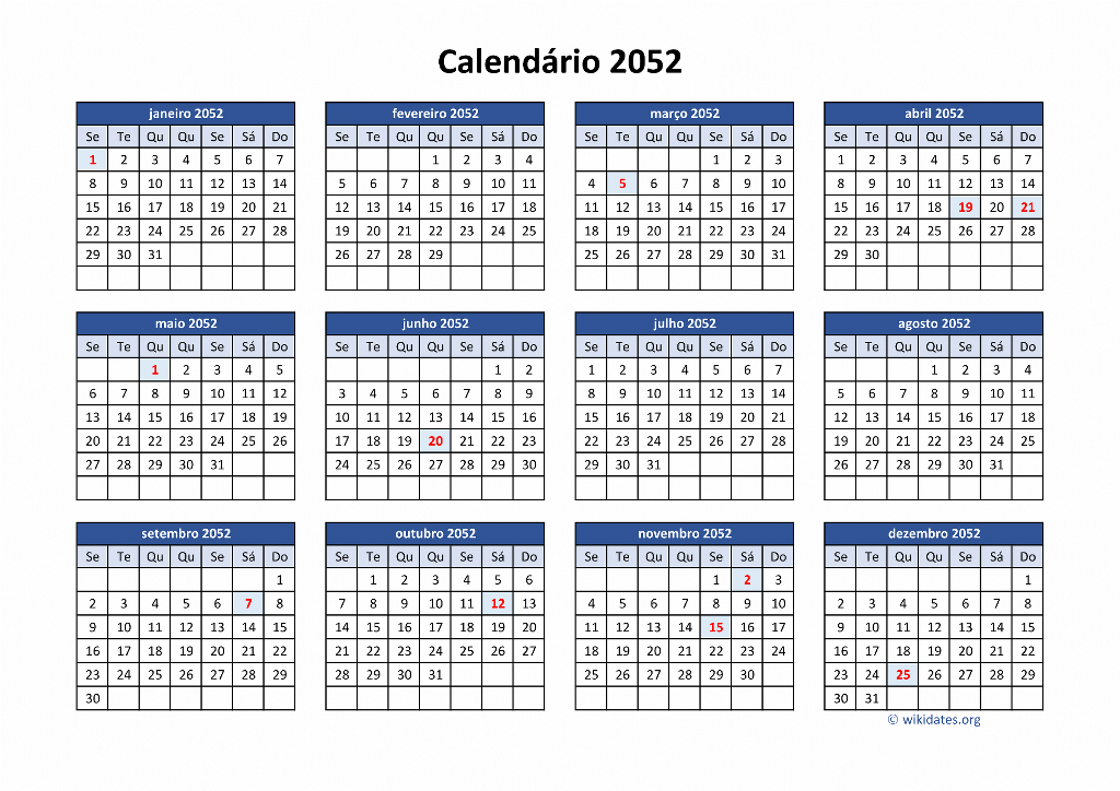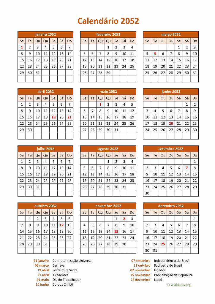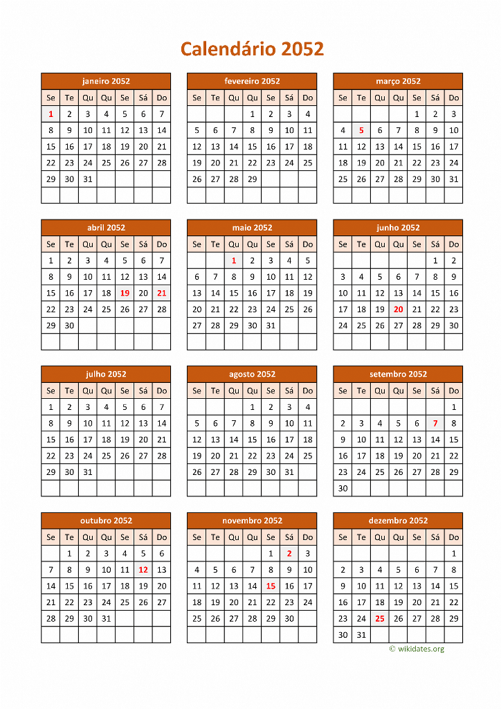 • Calendários mensais de 2052 (gratuito e de impressão) por 12 meses a 12 páginas (um mês por página), com feriados e número da semana (semana começa na segunda-feira).