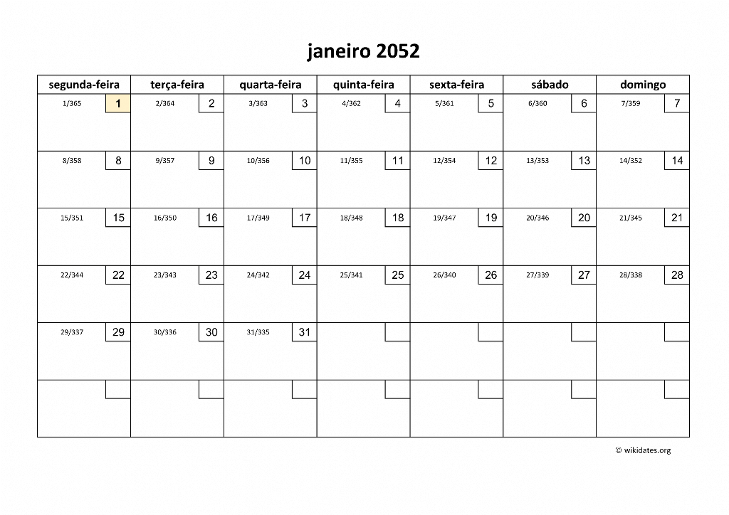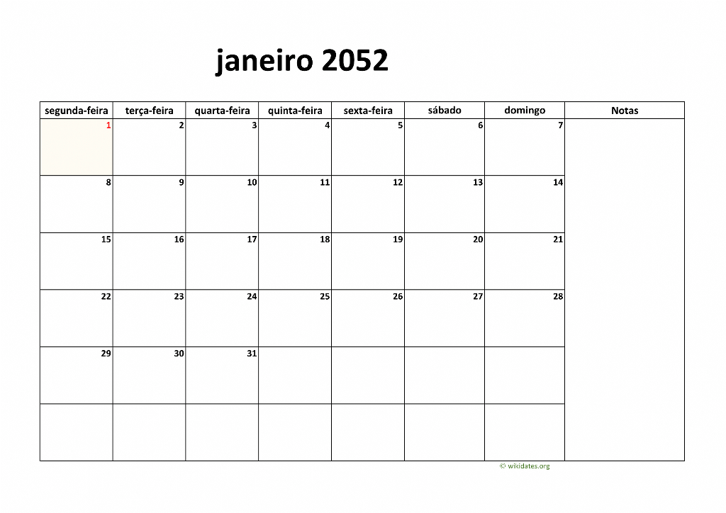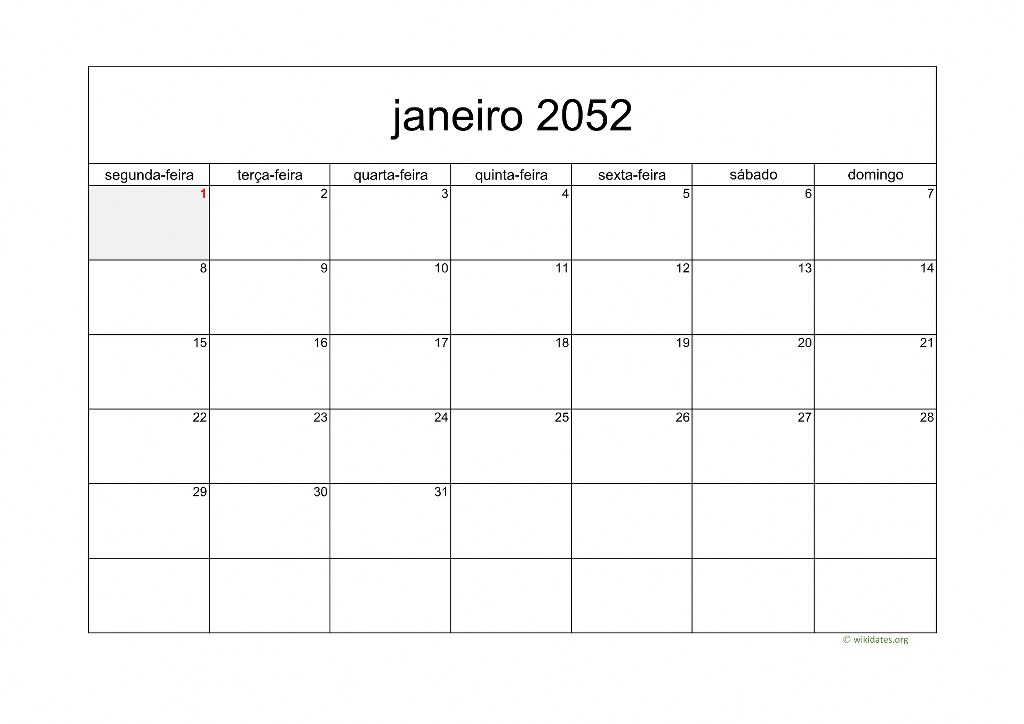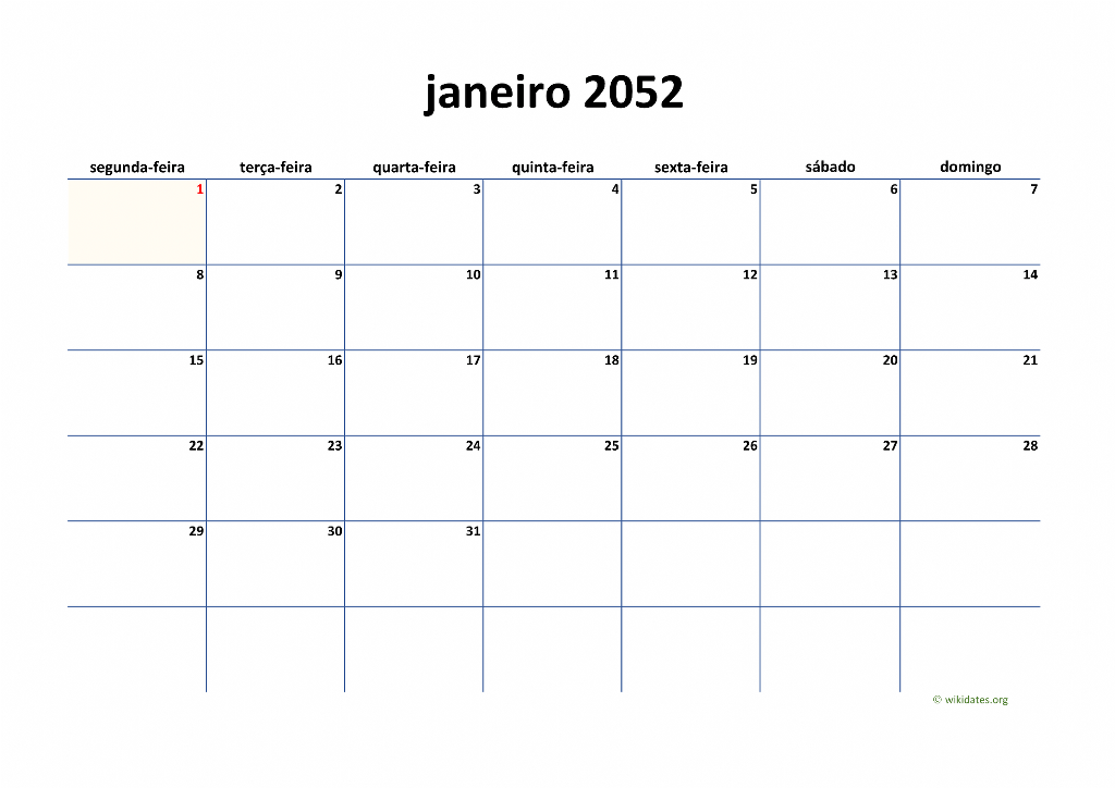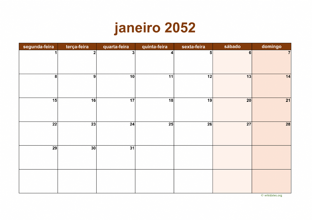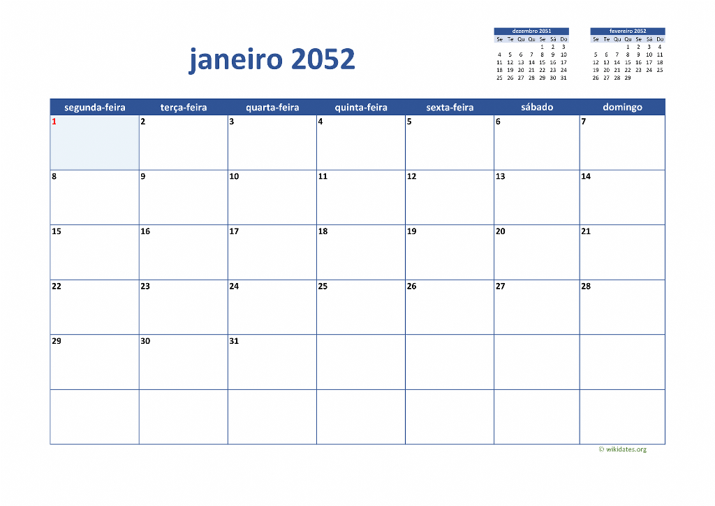 • Calendários mensais de 2052 (gratuito e de impressão) por 12 meses a 12 páginas (um mês por página), com feriados e número da semana (semana começa na segunda-feira).