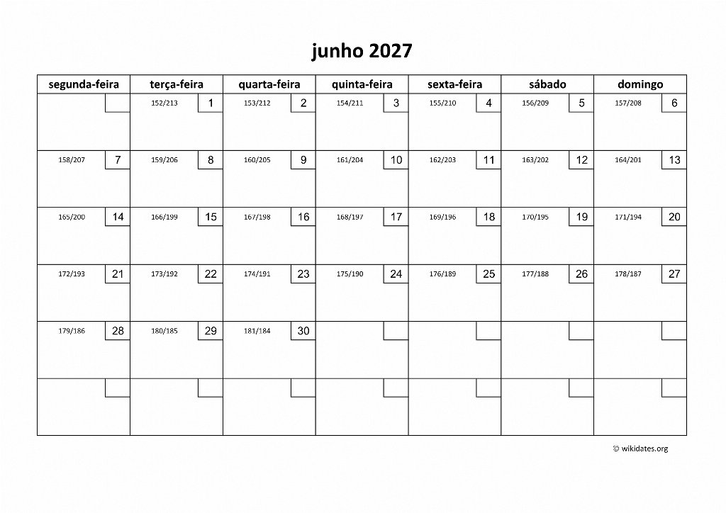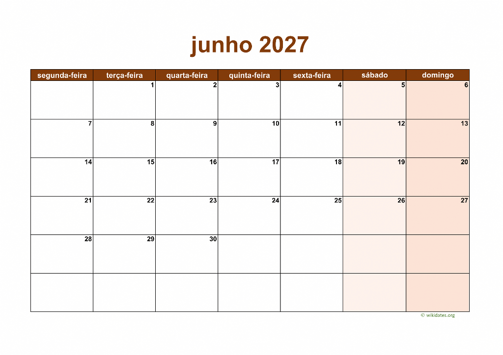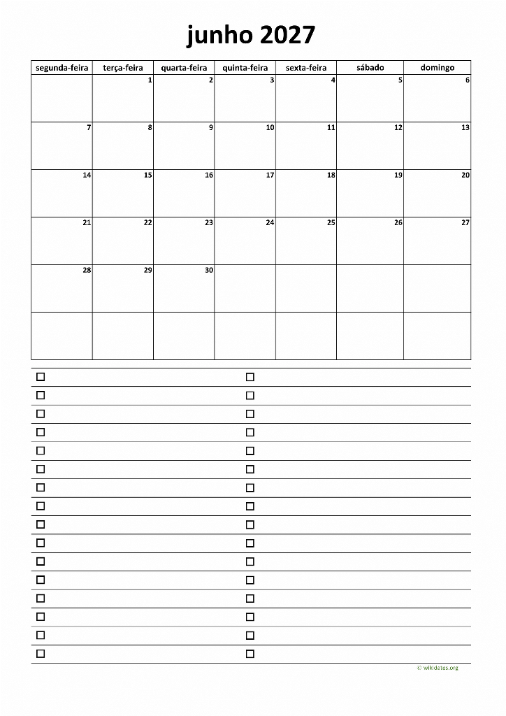 • Vá a esta página para baixar o calendário de 2027 (semana começa na segunda-feira).