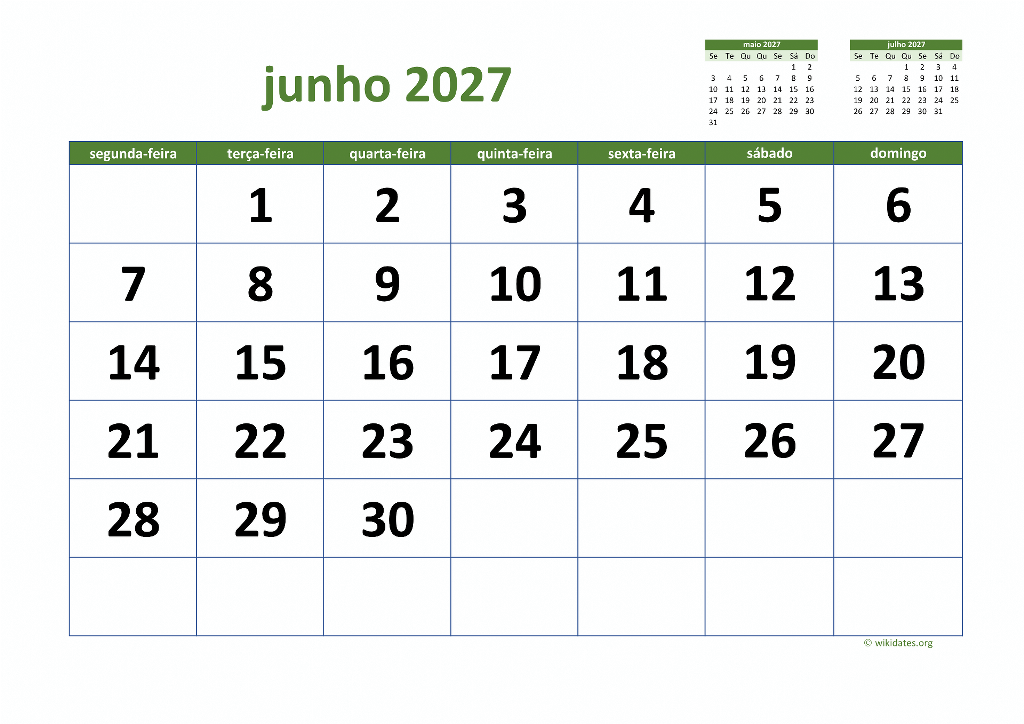 • Baixar Calendário Junho 2027 com feriados e número da semana como MS Word, PDF, JPG em formato A4.