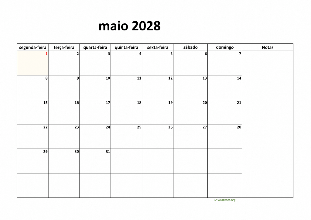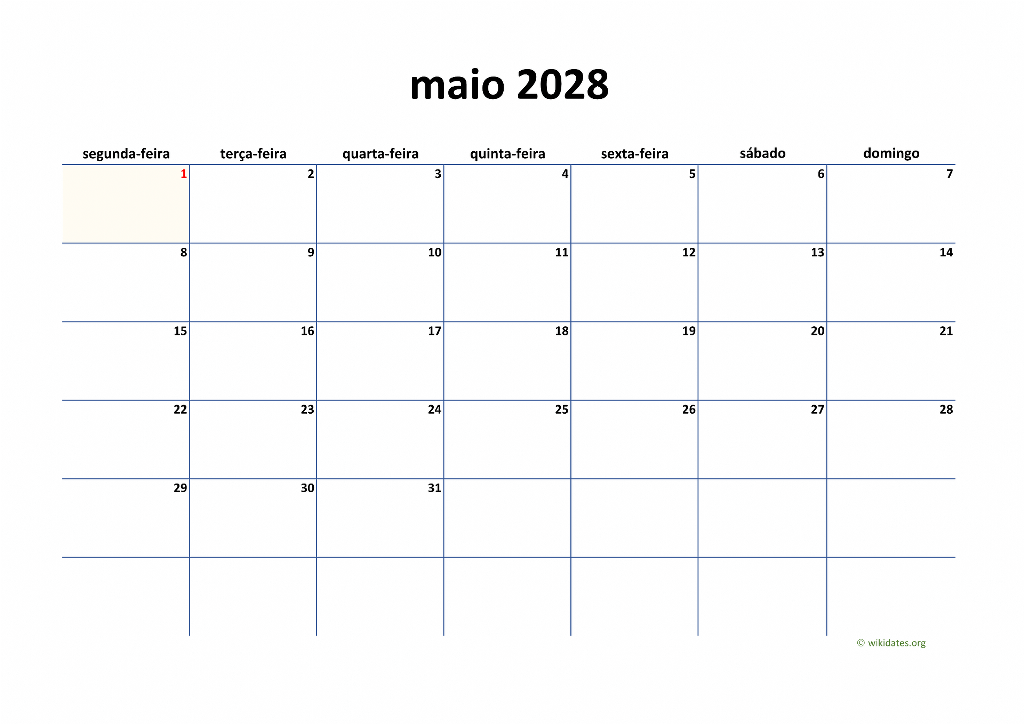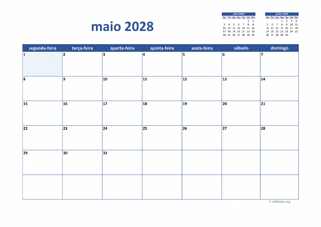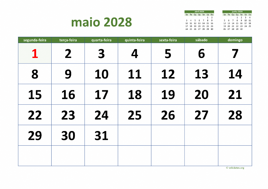 • Vá a esta página para baixar o calendário de 2028 (semana começa na segunda-feira).