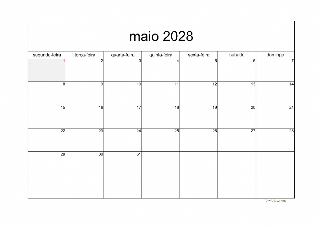 Calendário Maio 2028