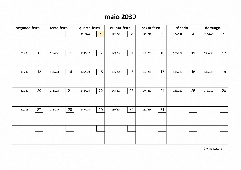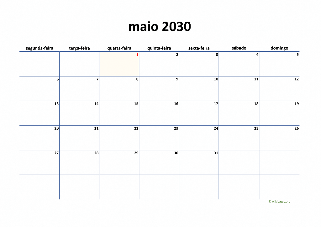 Calendário Maio 2030