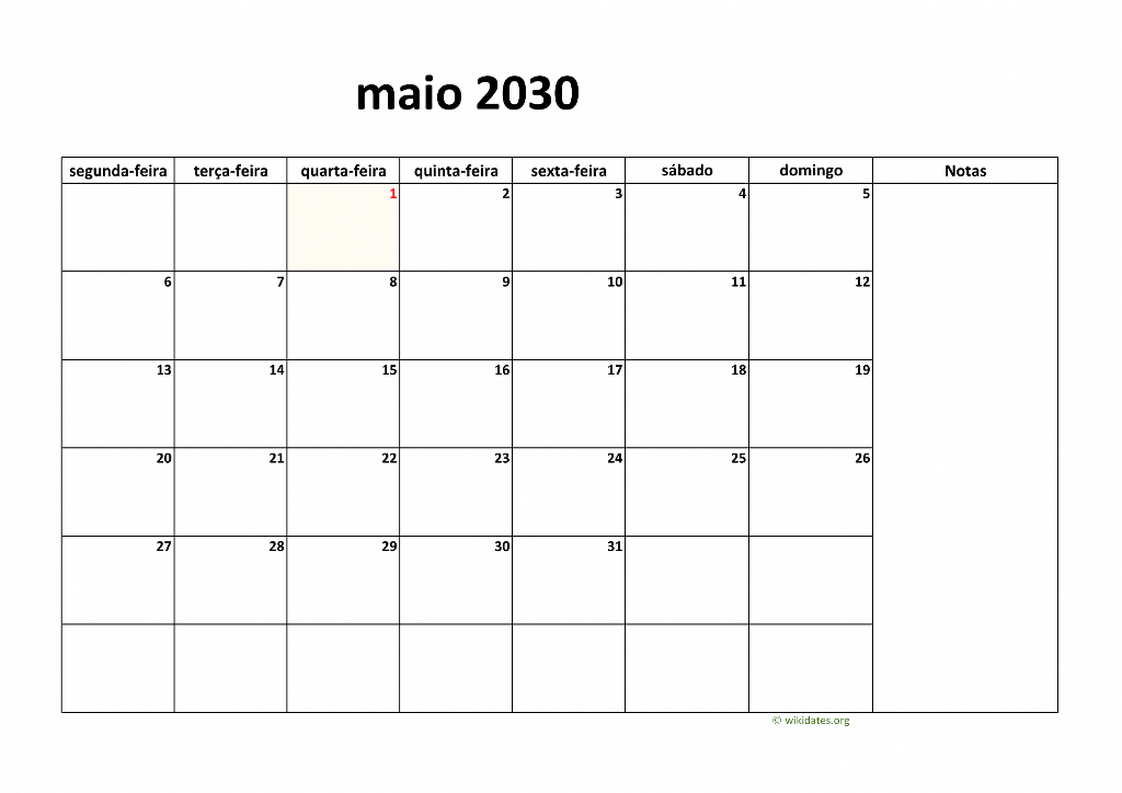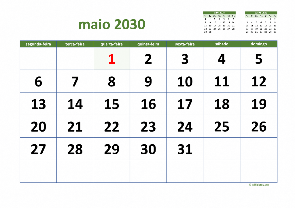 • Vá a esta página para baixar o calendário de 2030 (semana começa na segunda-feira).