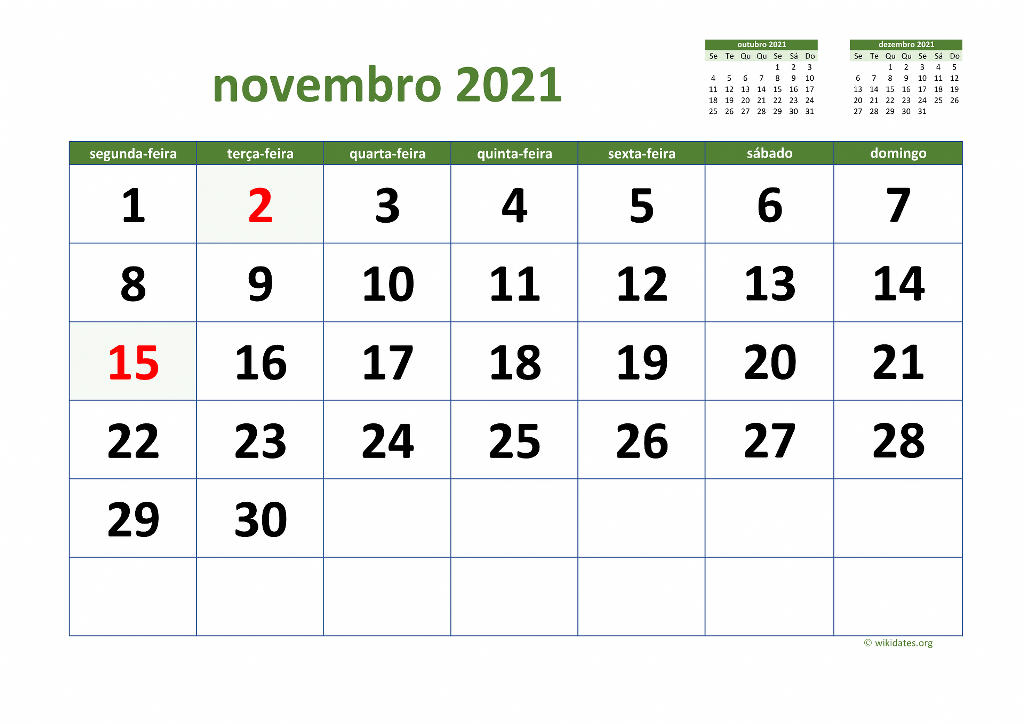 Calendário Novembro 2021 no Brasil