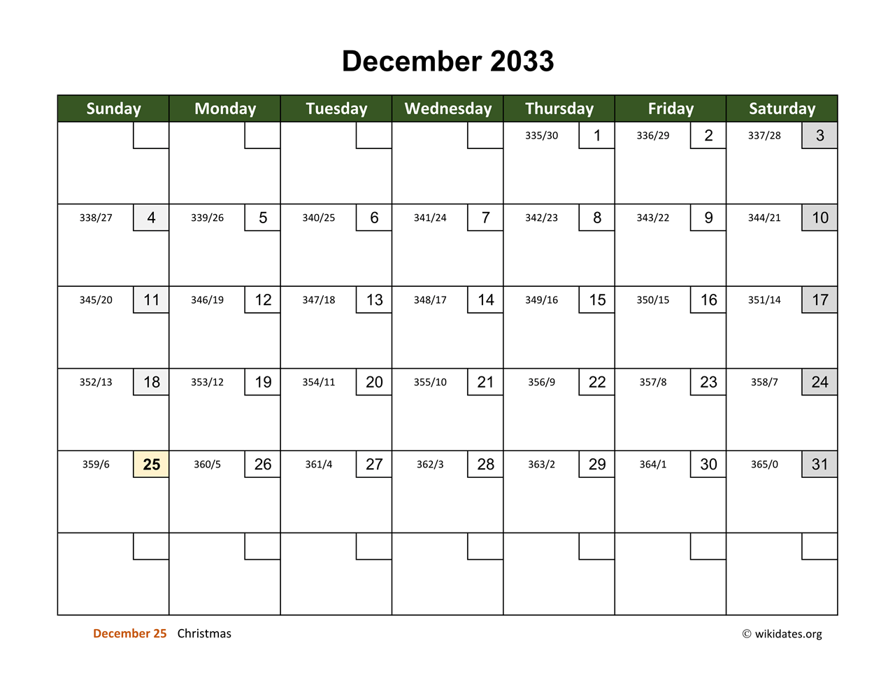 December 2033 calendar with day numbers, including US federal holidays, available in PDF file format, landscape/horizontal orientation, free for print or download.
