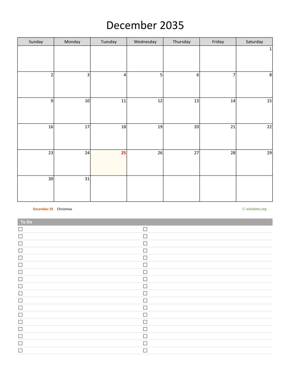 December 2035 calendar with to-do list set with darker grid headers. This monthly planner for december 2035 lets you print with a wide space for to do items. You can also include your schedule, events and holidays.