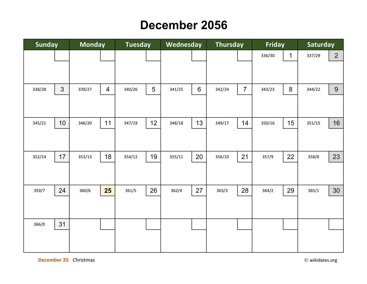 December 2056 calendar with day numbers, including US federal holidays, available in PDF file format, landscape/horizontal orientation, free for print or download.