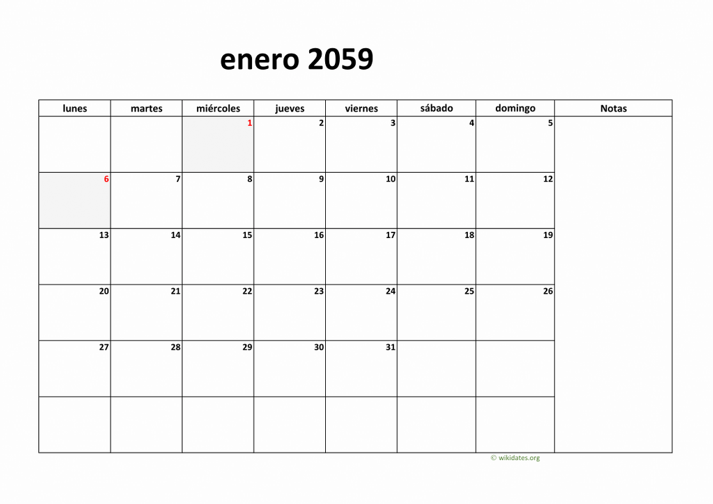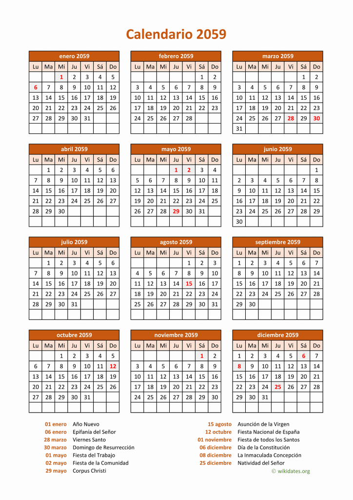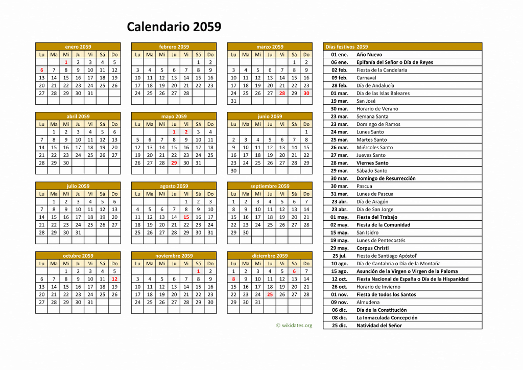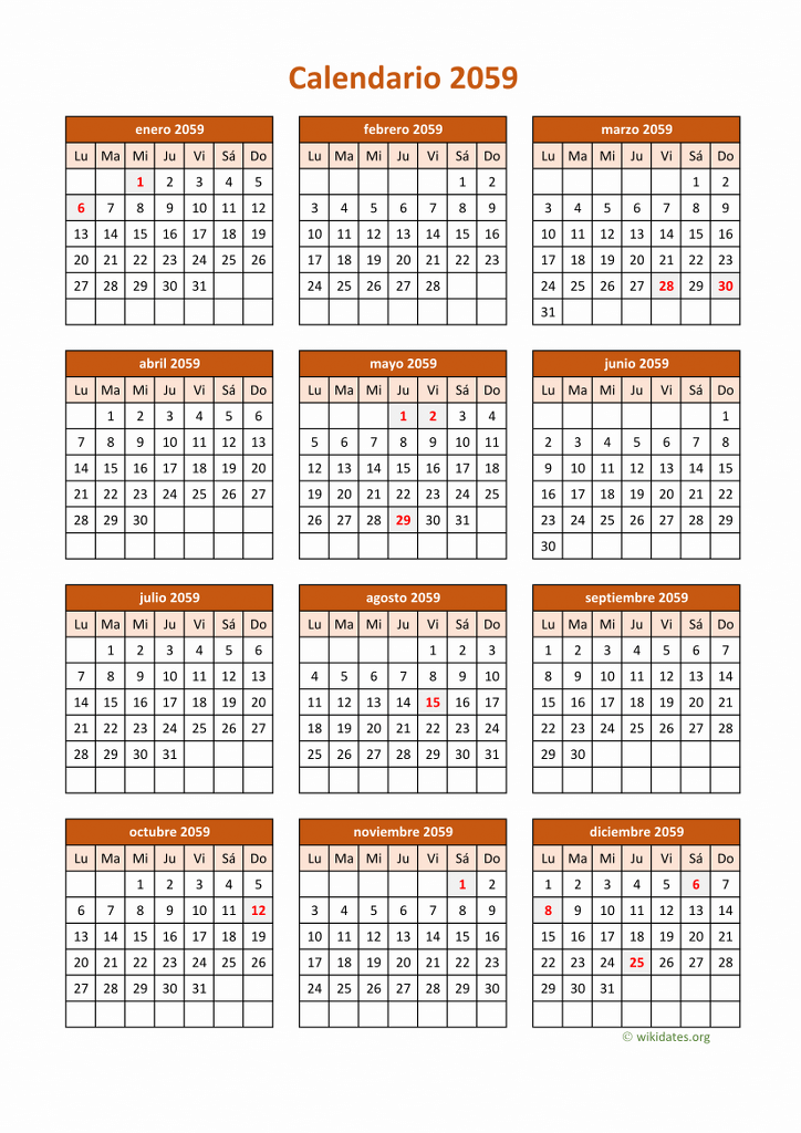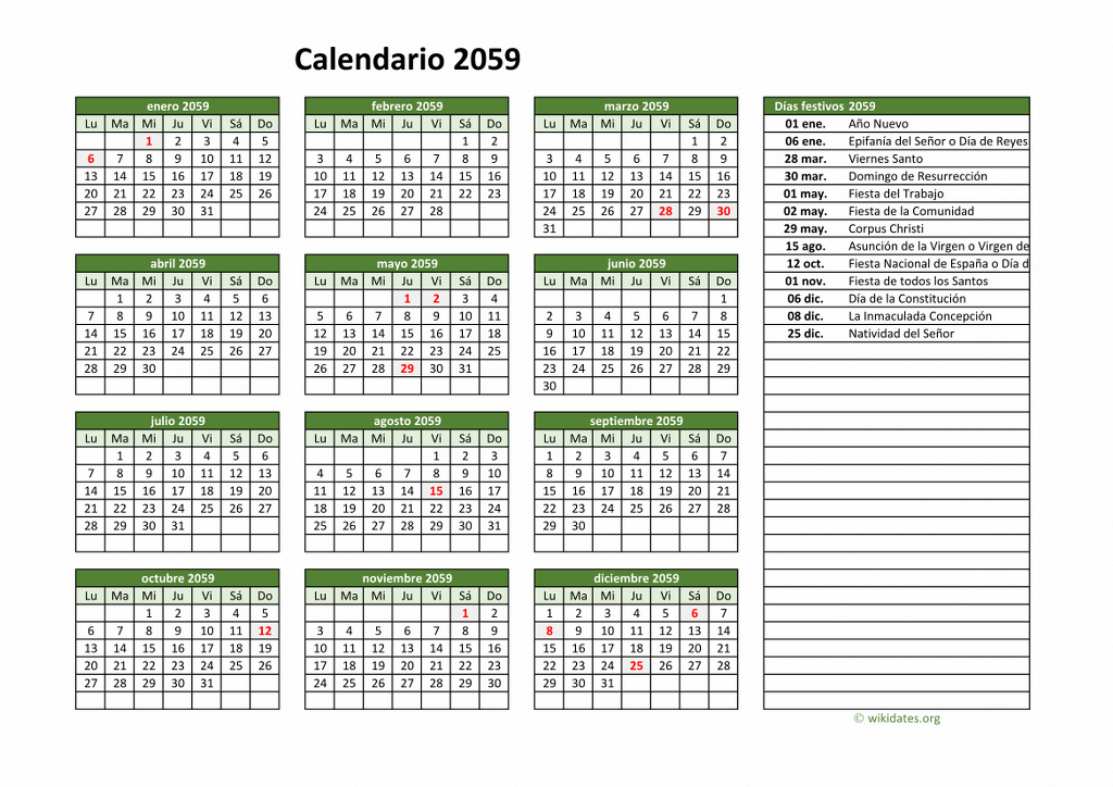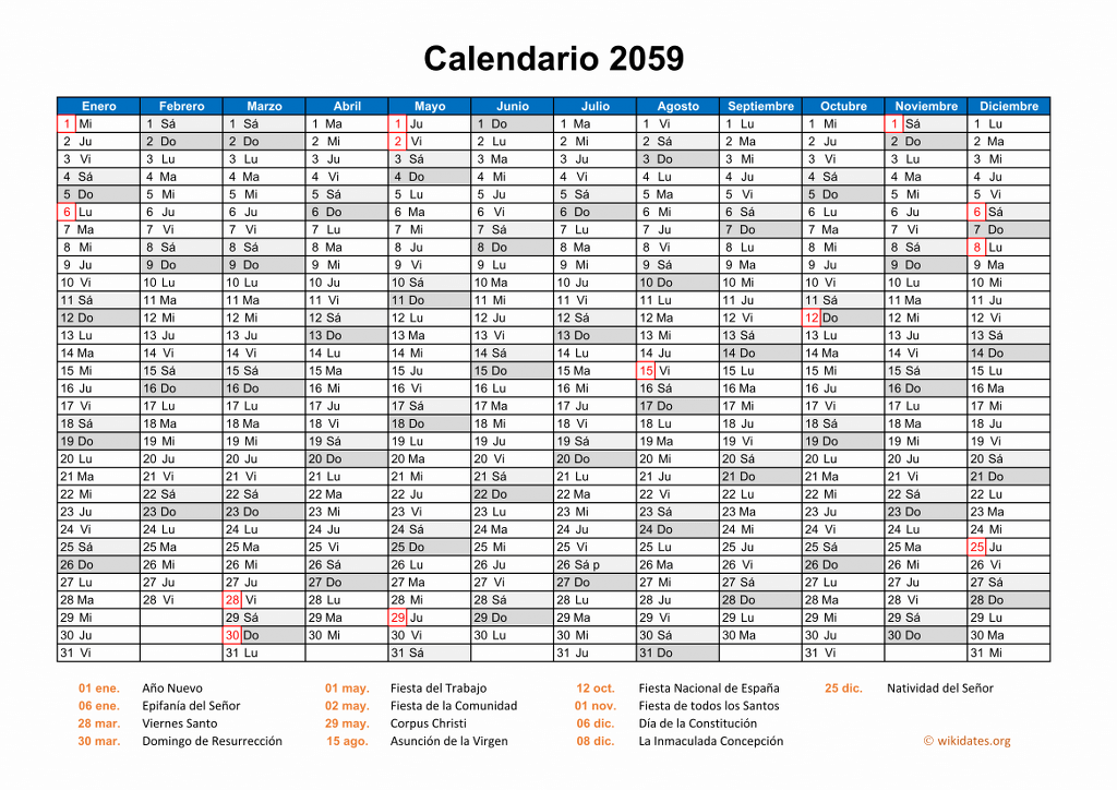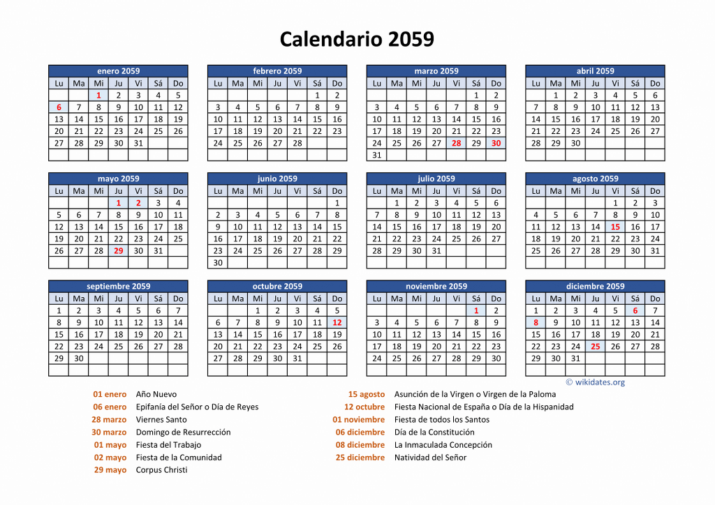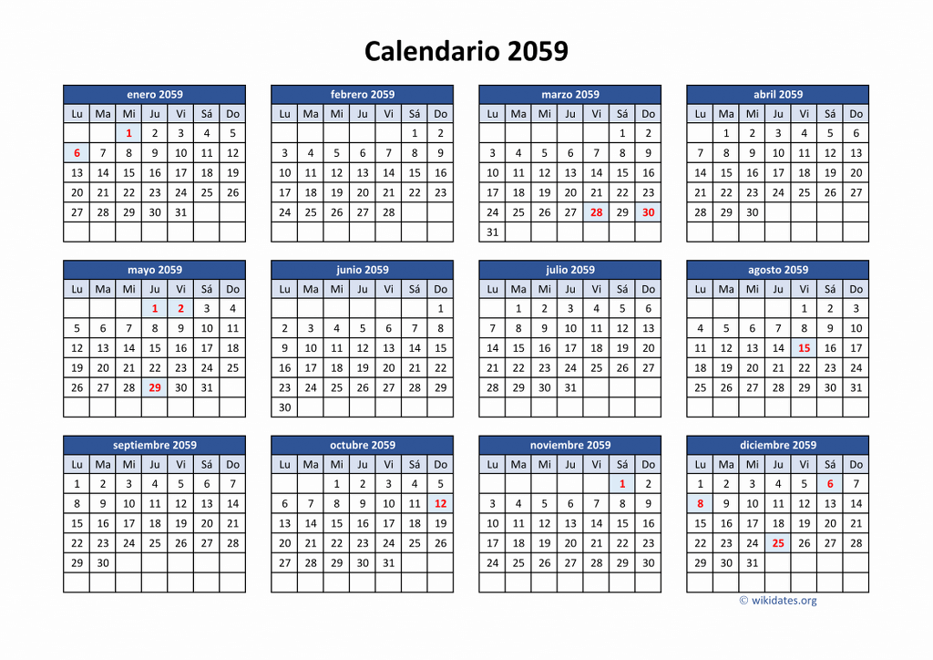 • Calendario anual 2059 gratis para imprimir y de 12 meses en una página, con los días festivos