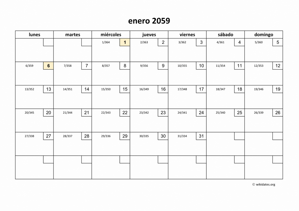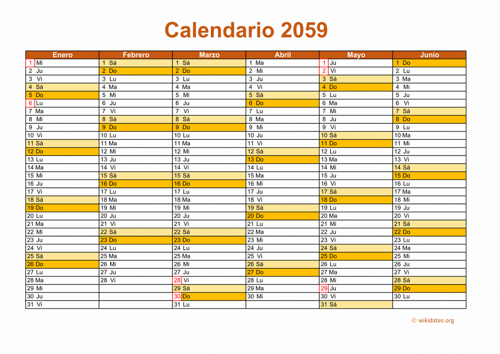 • Descargar Calendario 2059 con los días festivos y número de la semana como MS Word, PDF y JPG en formato A4.