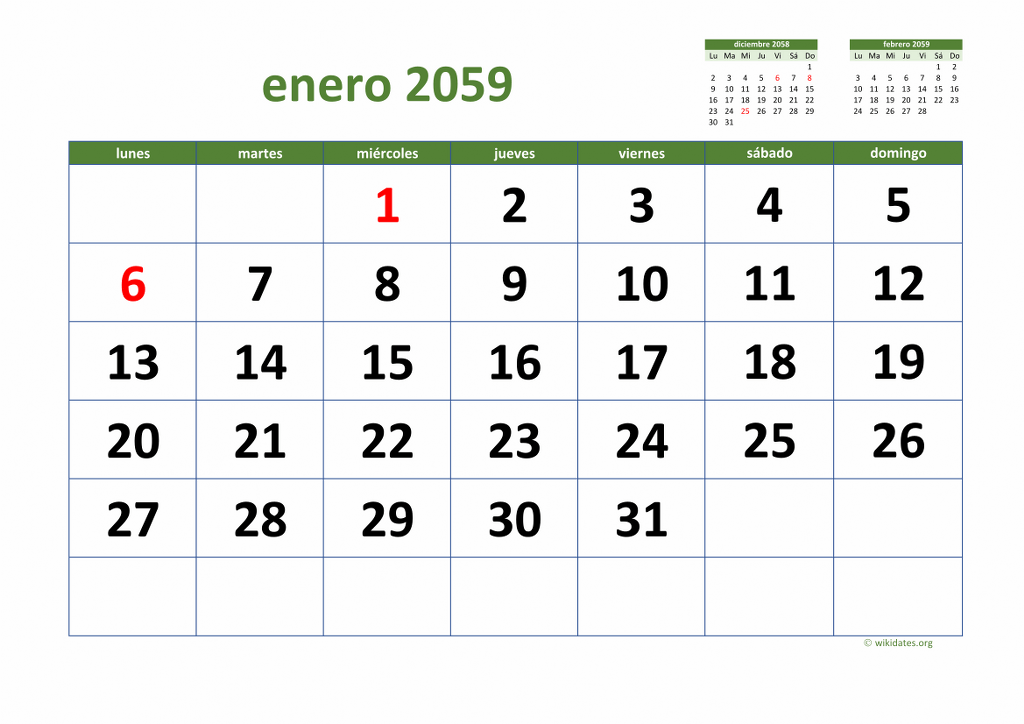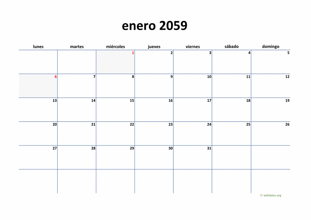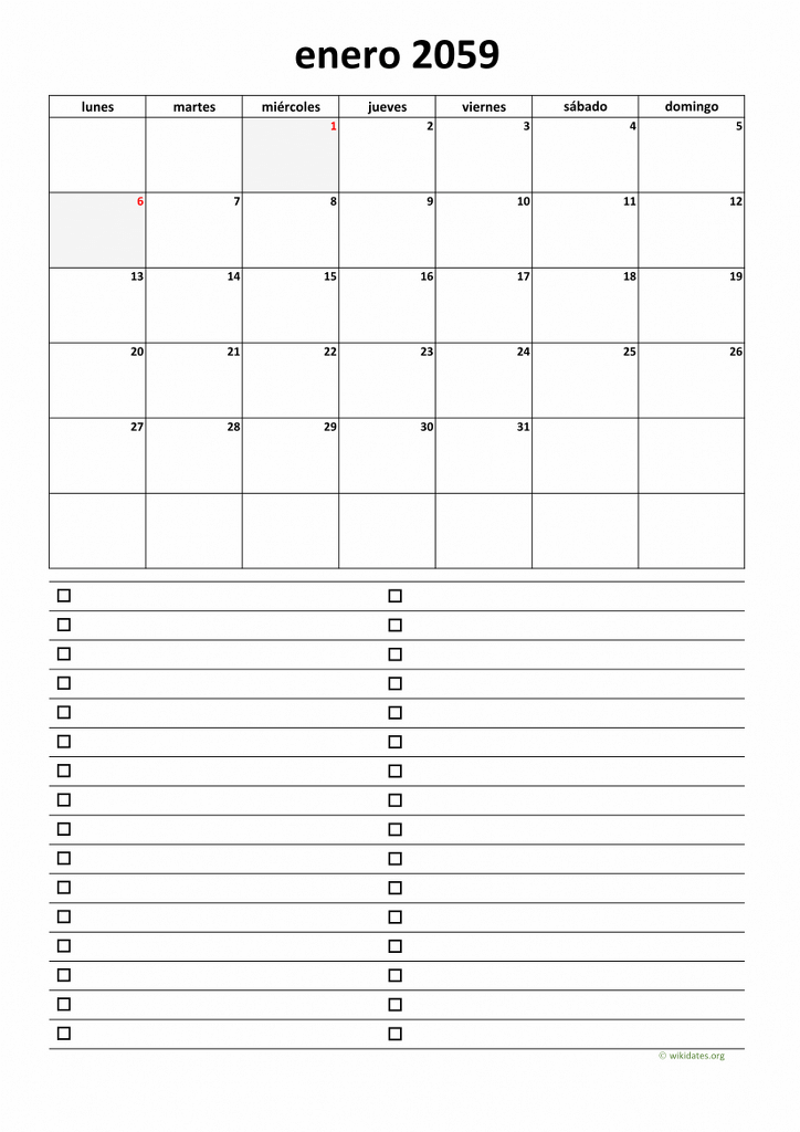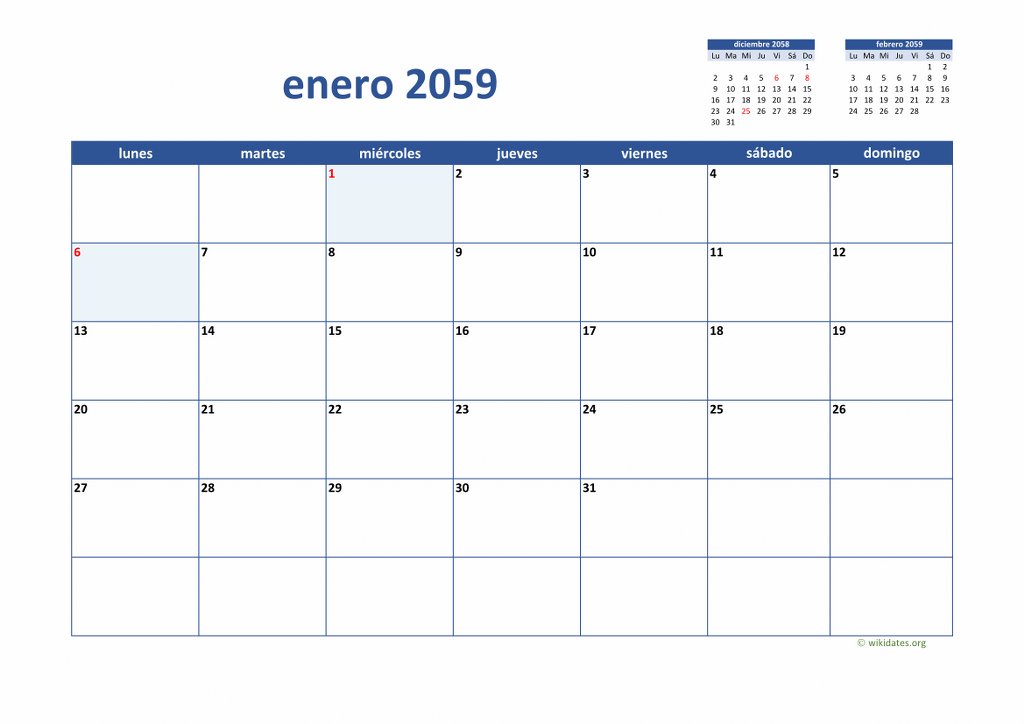 • Calendario mensual 2059 gratis para imprimir y de 12 meses en 12 páginas (un mes por página), con los días festivos.