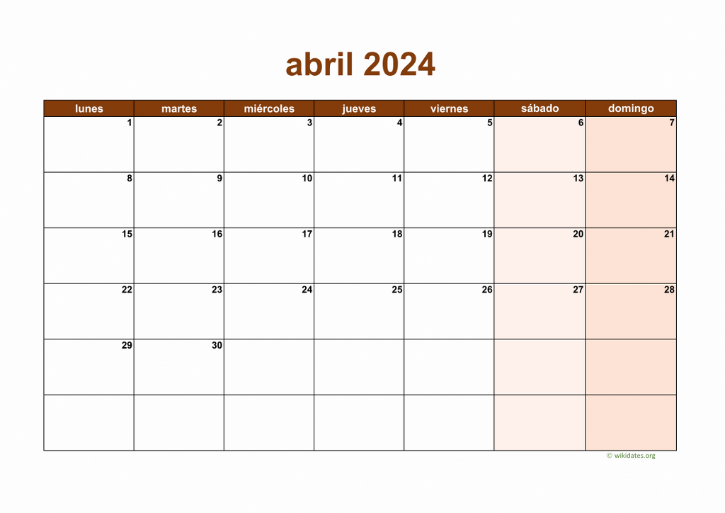 • Calendario Abril 2024 con los días festivos, gratis, para imprimir.