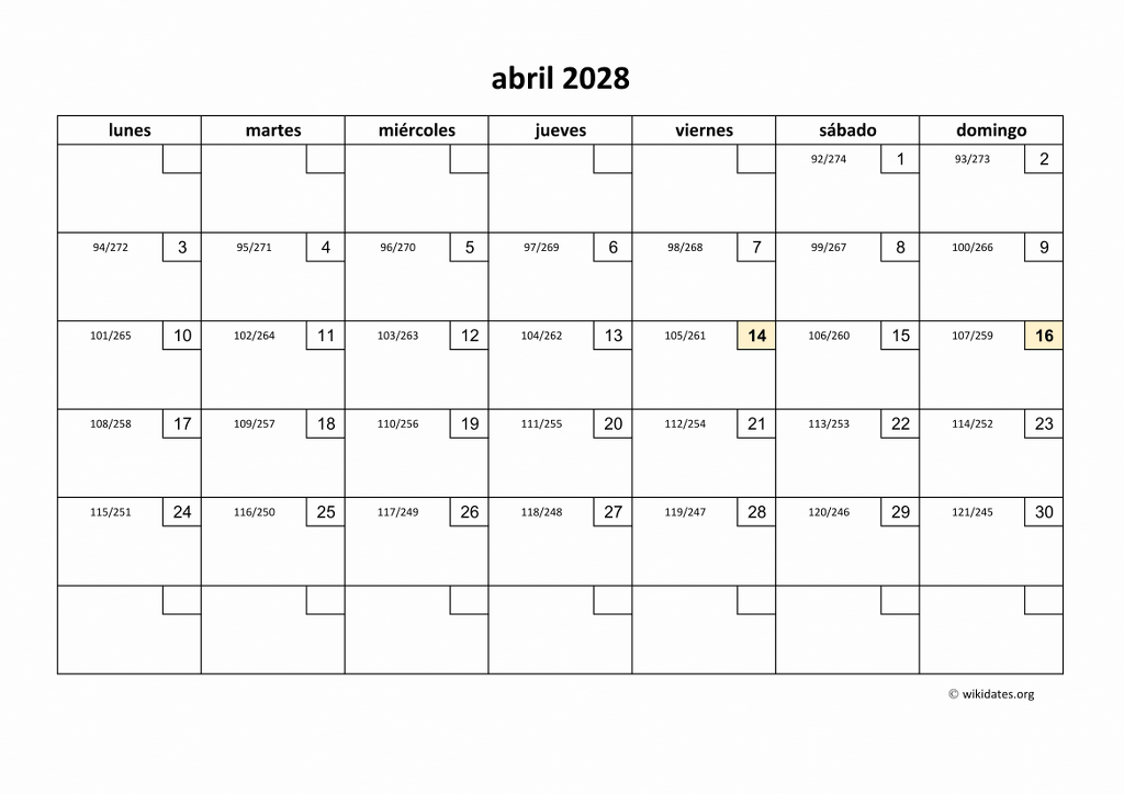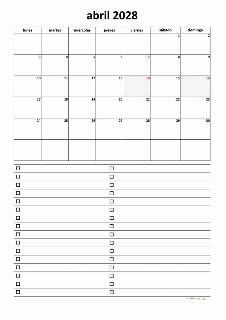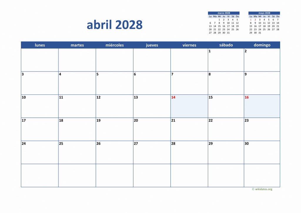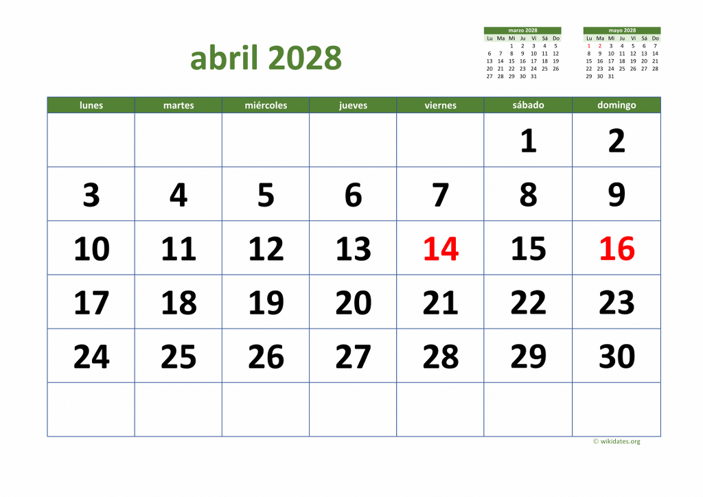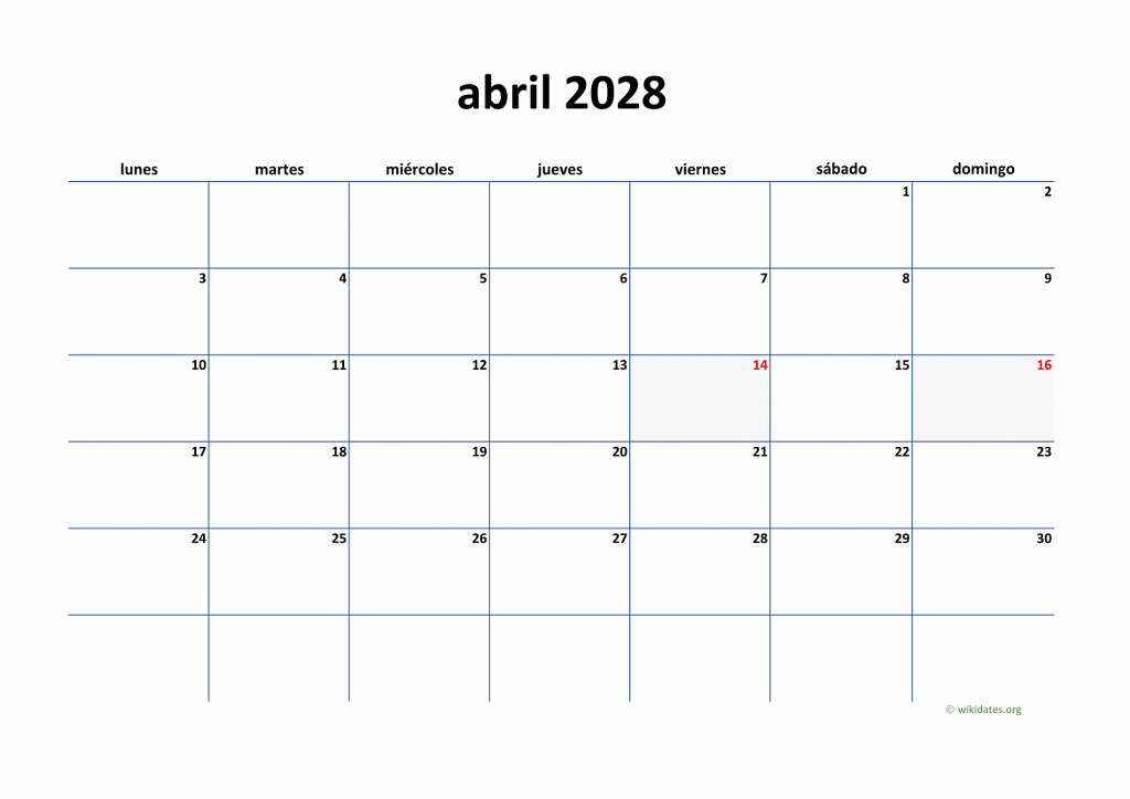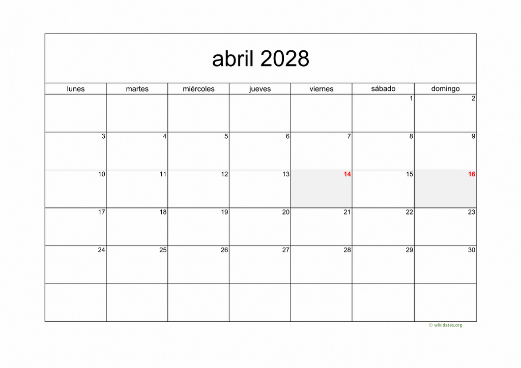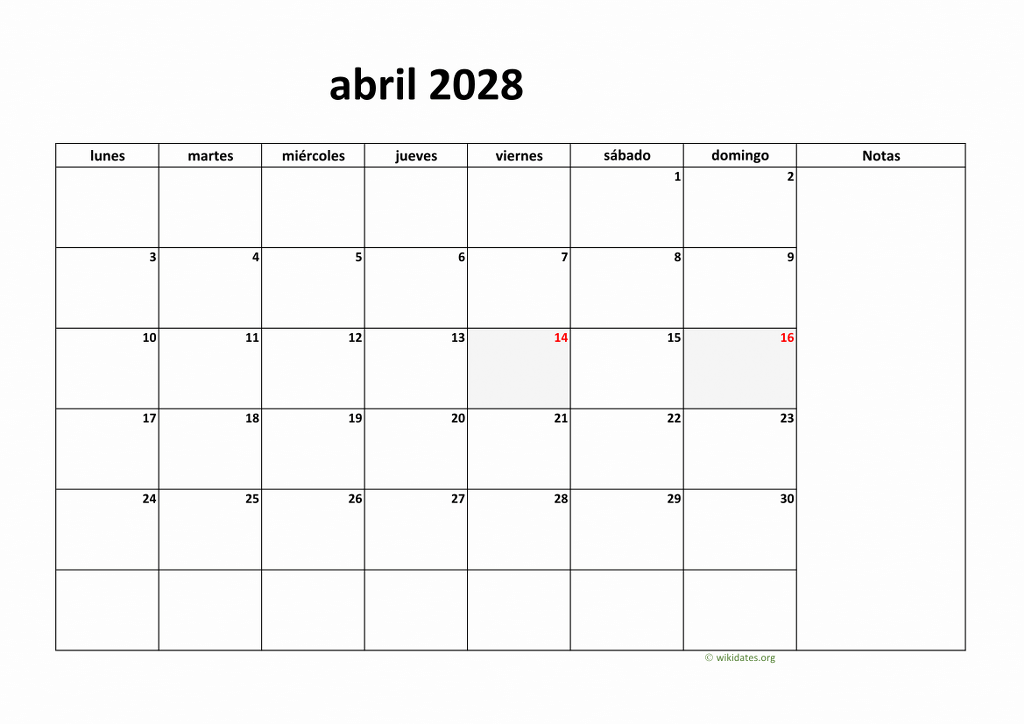 • Calendario Abril 2028 con los días festivos, gratis, para imprimir.
