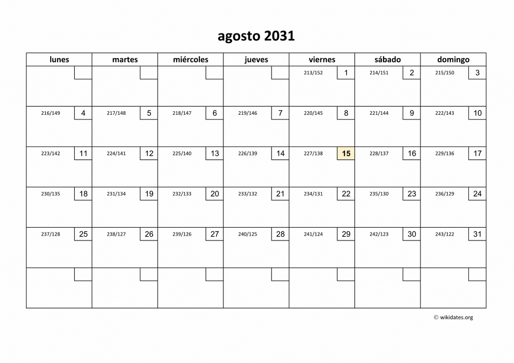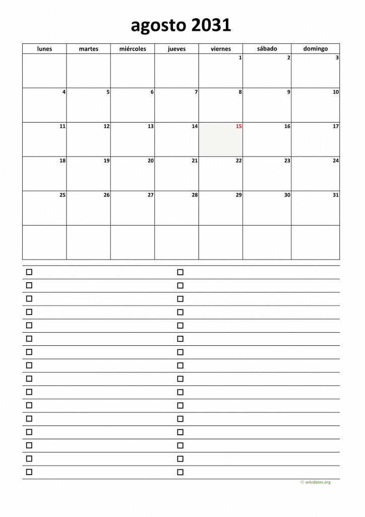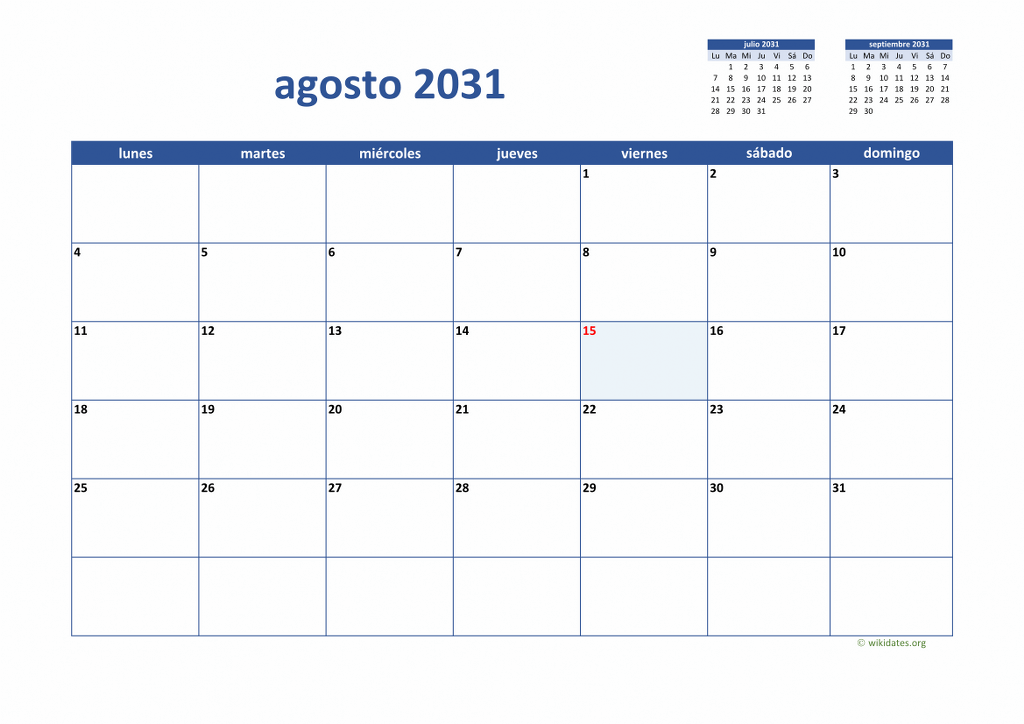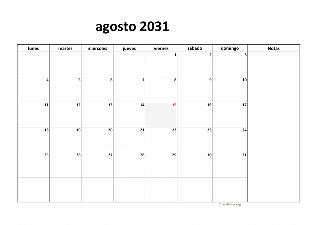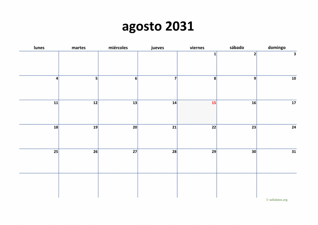 • Calendario Agosto 2031 con los días festivos, gratis, para imprimir.