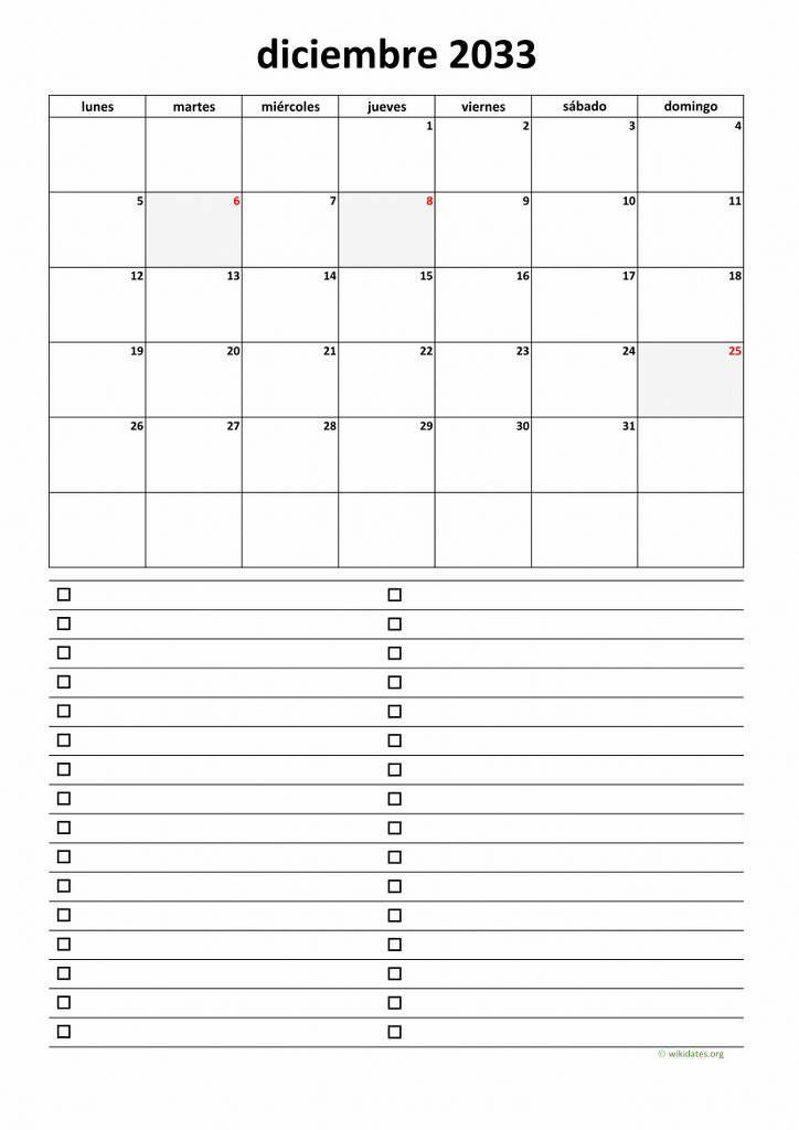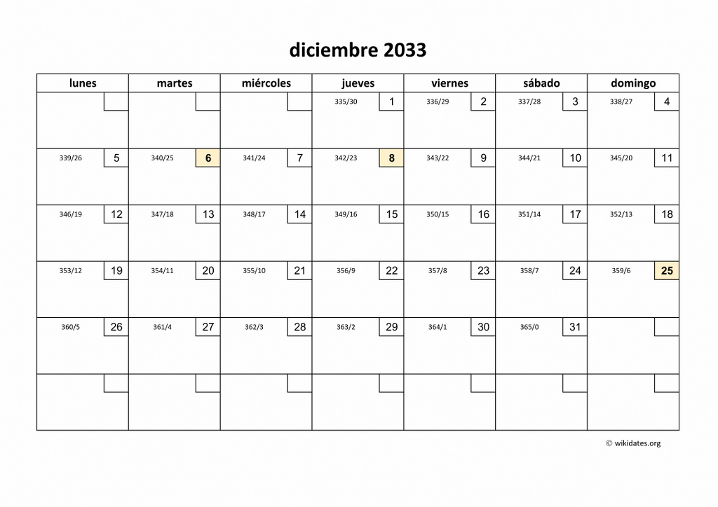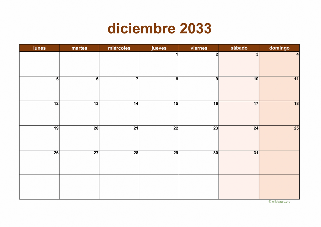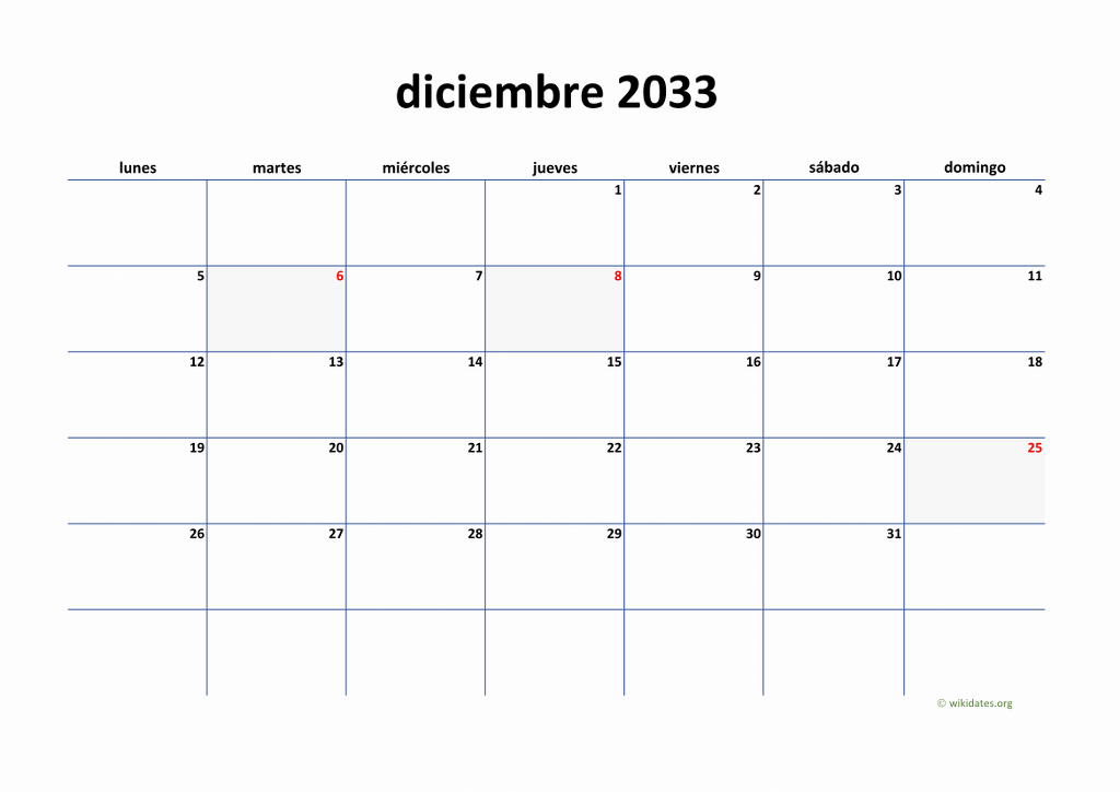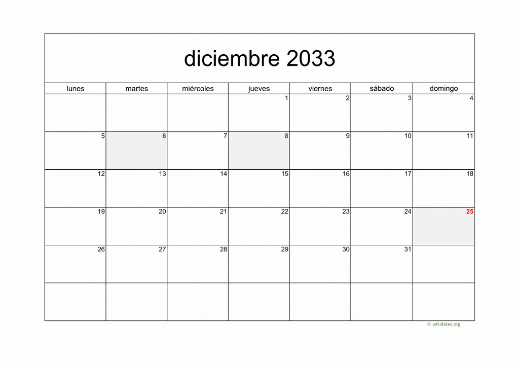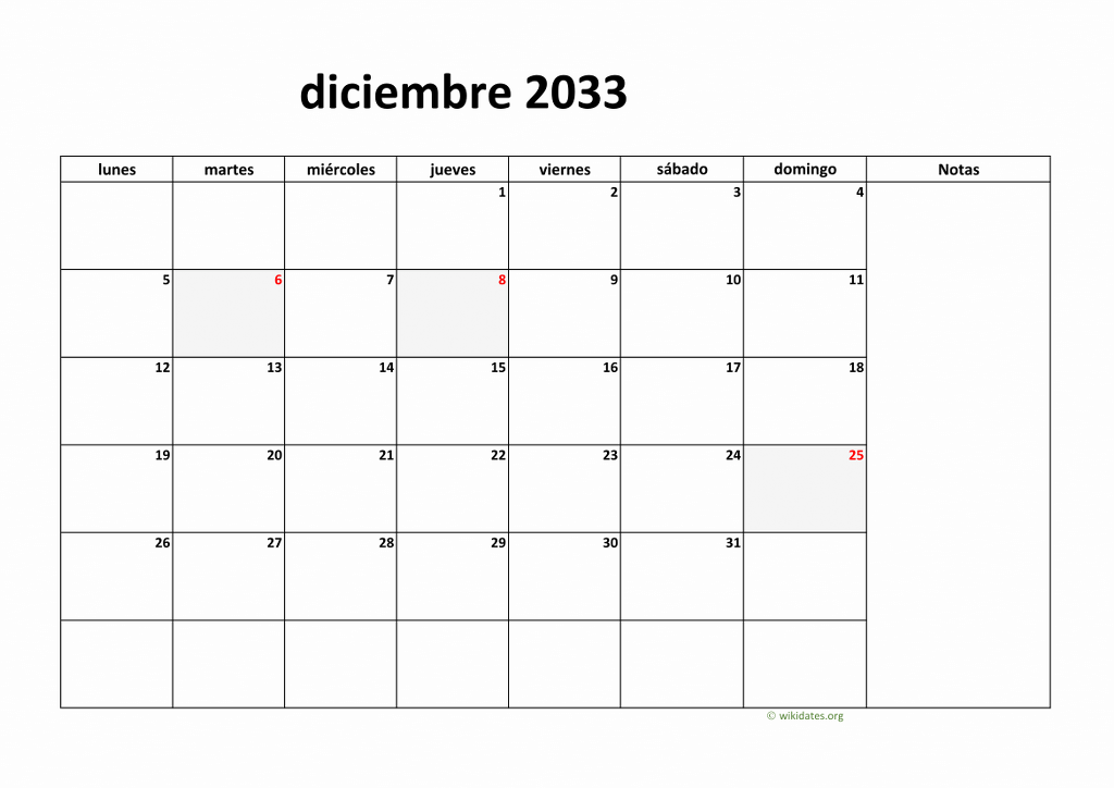 • Calendario Diciembre 2033 con los días festivos, gratis, para imprimir.