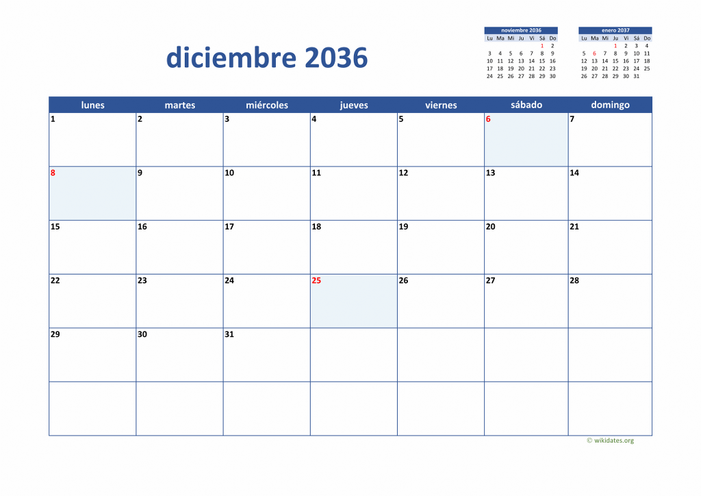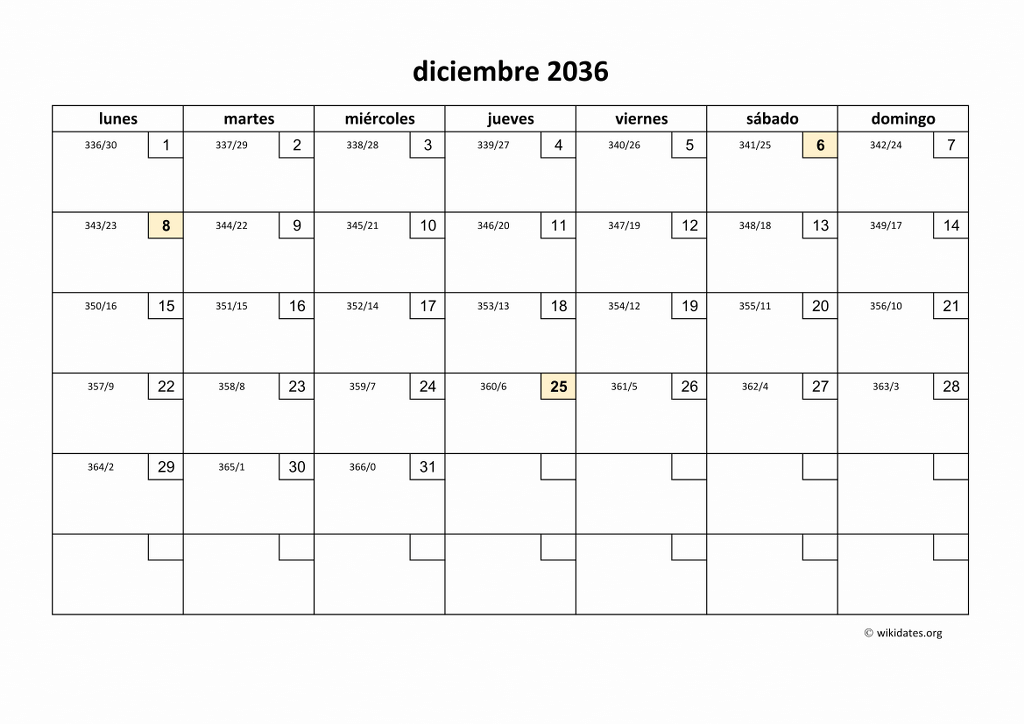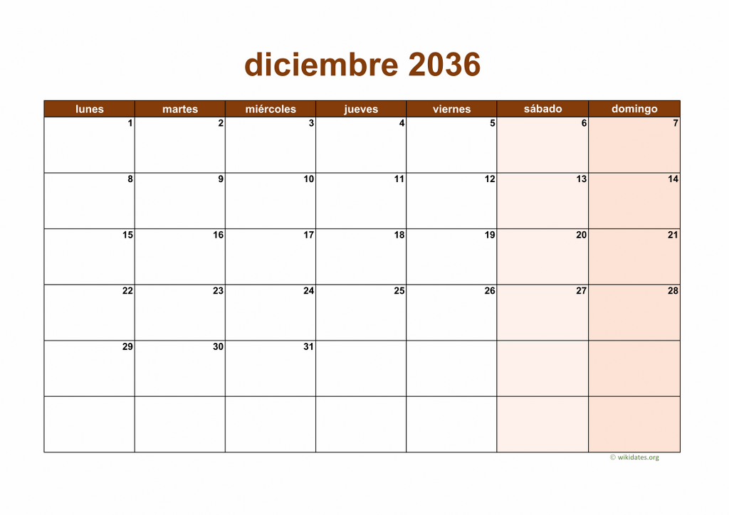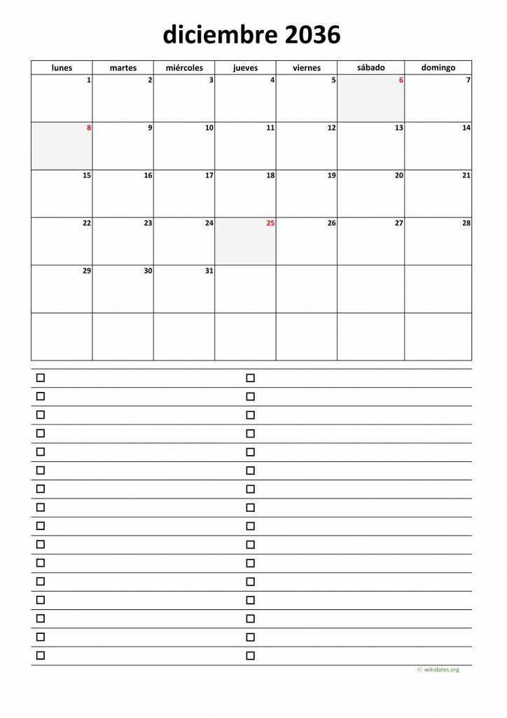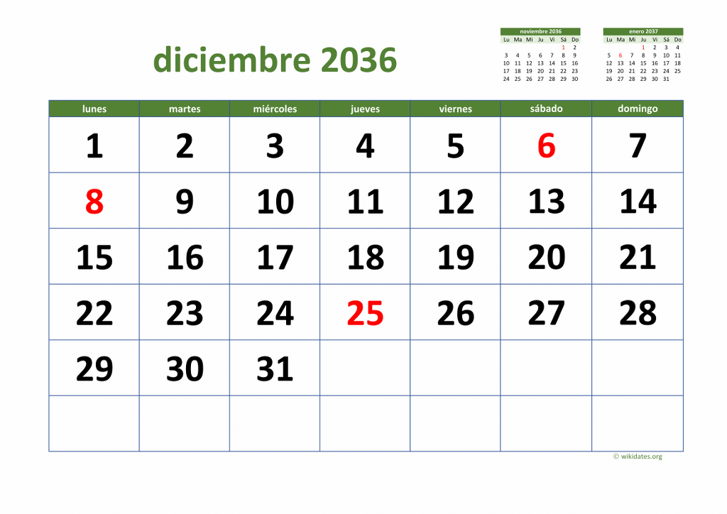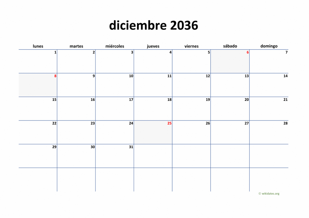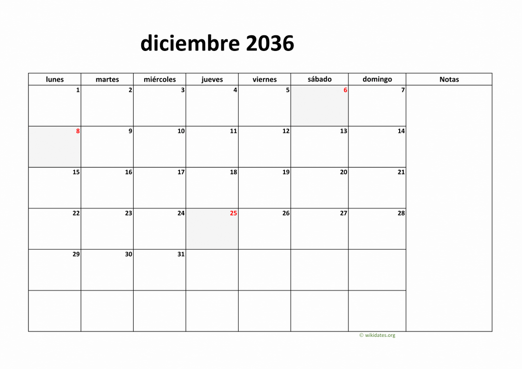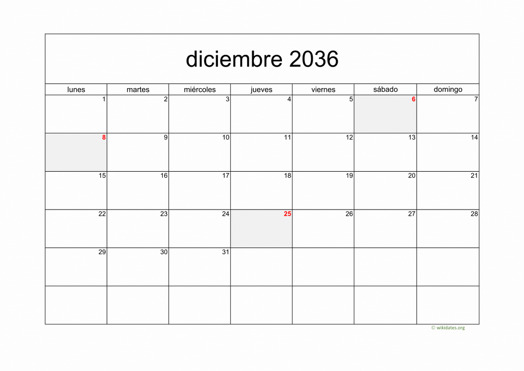 • Calendario Diciembre 2036 con los días festivos, gratis, para imprimir.