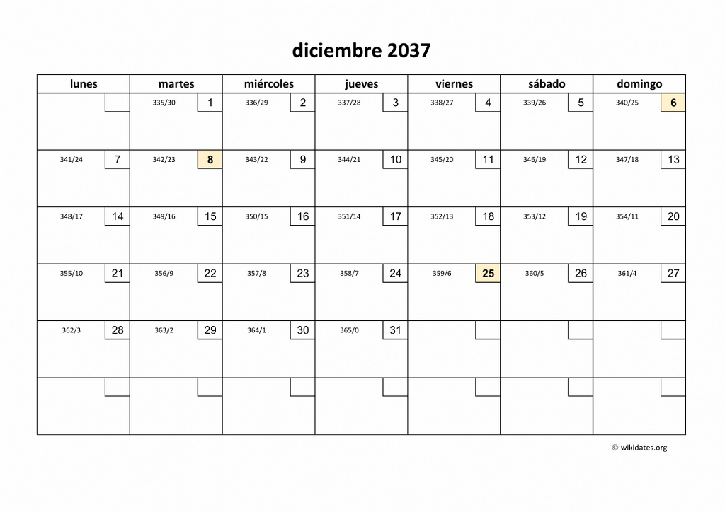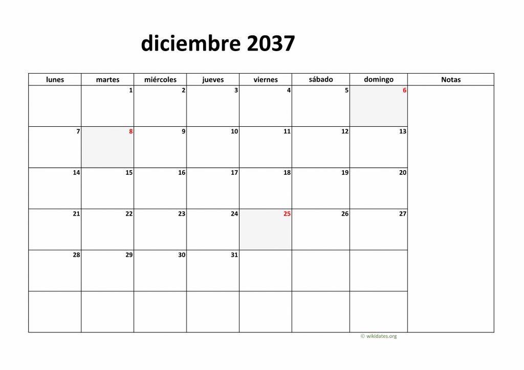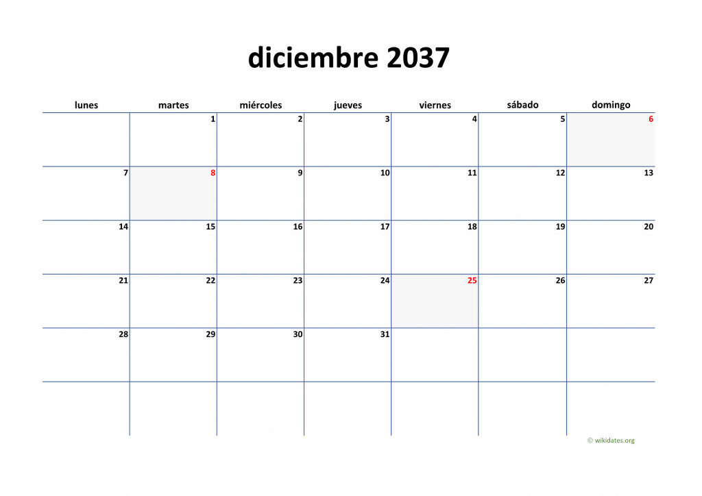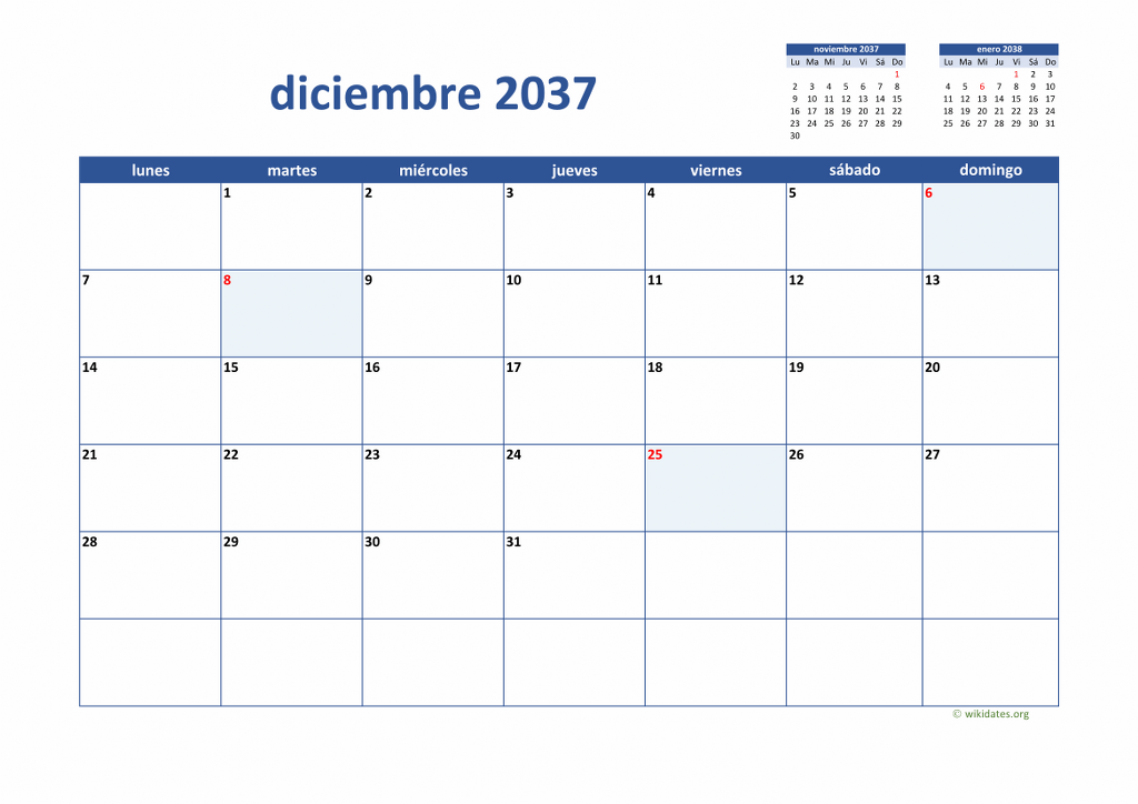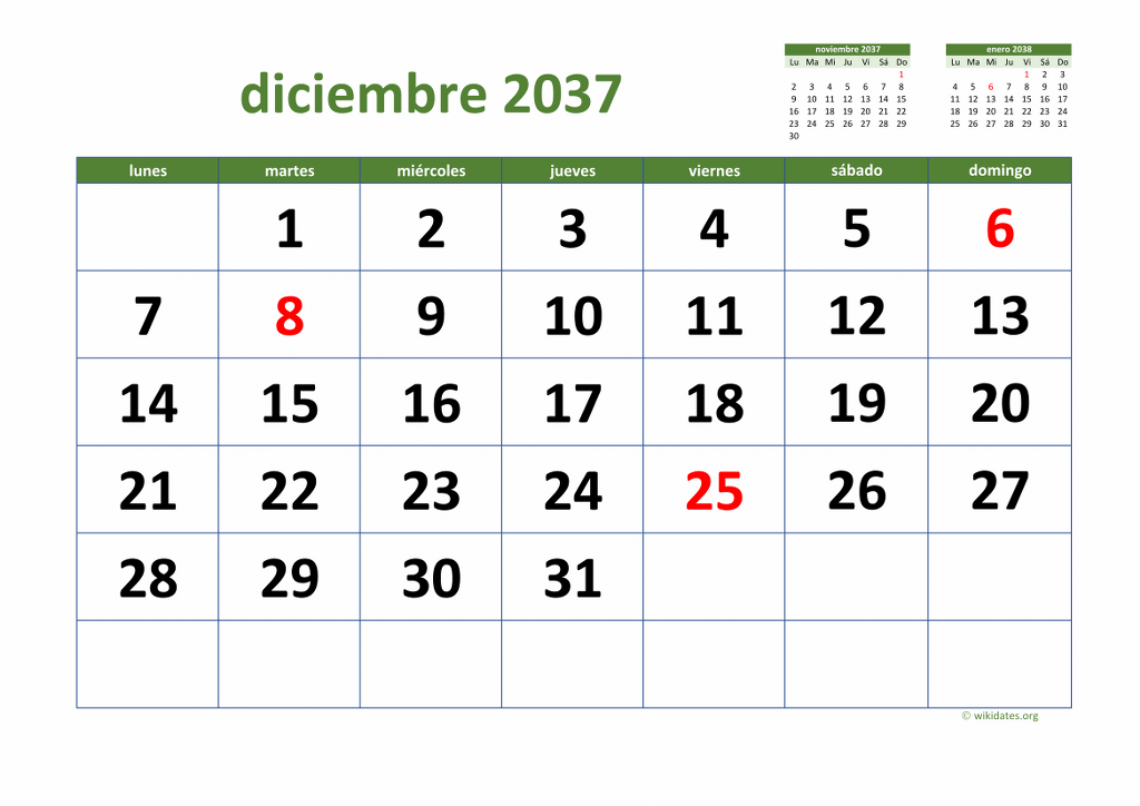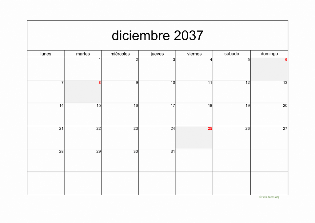 • Calendario Diciembre 2037 con los días festivos, gratis, para imprimir.
