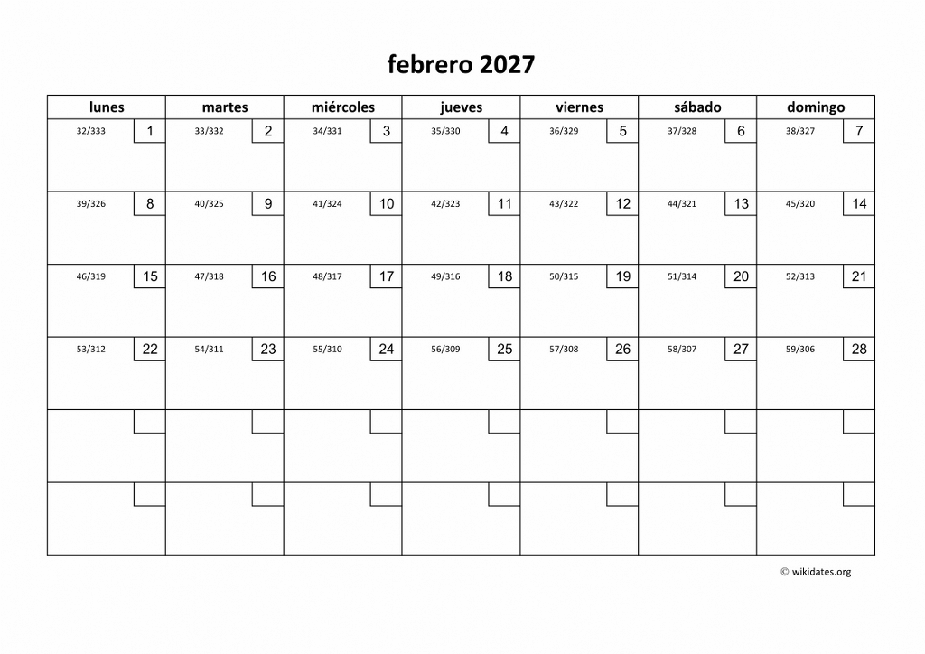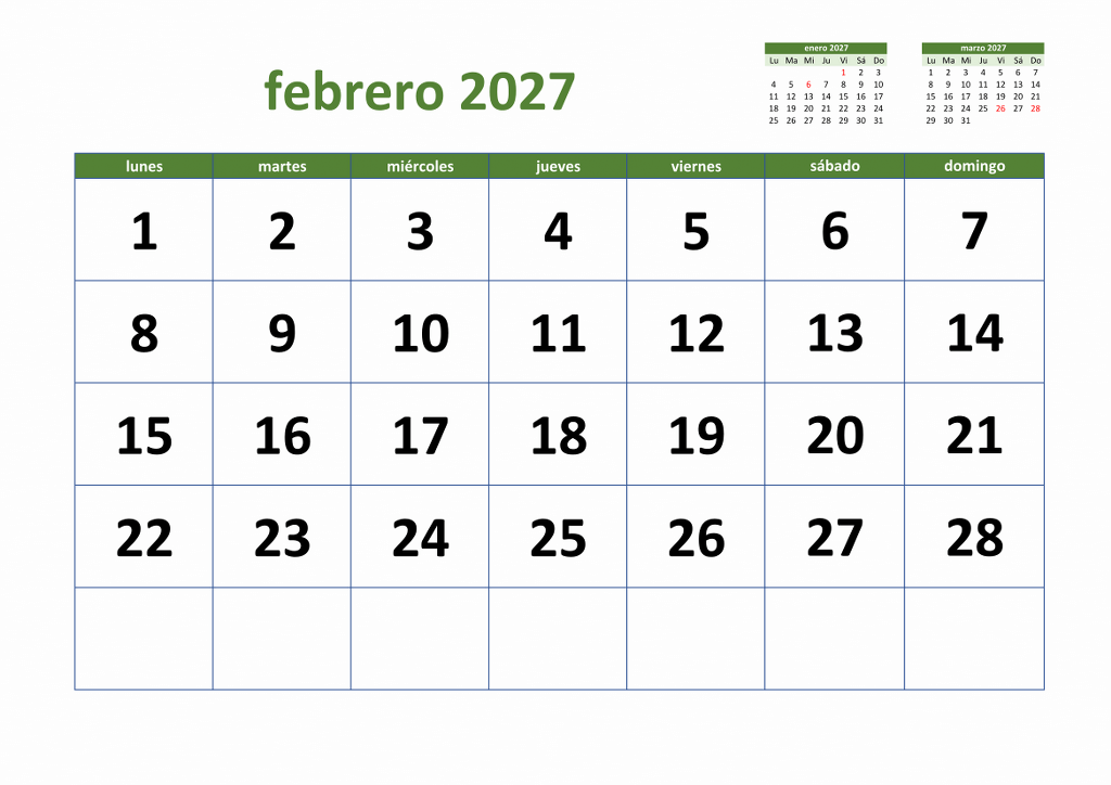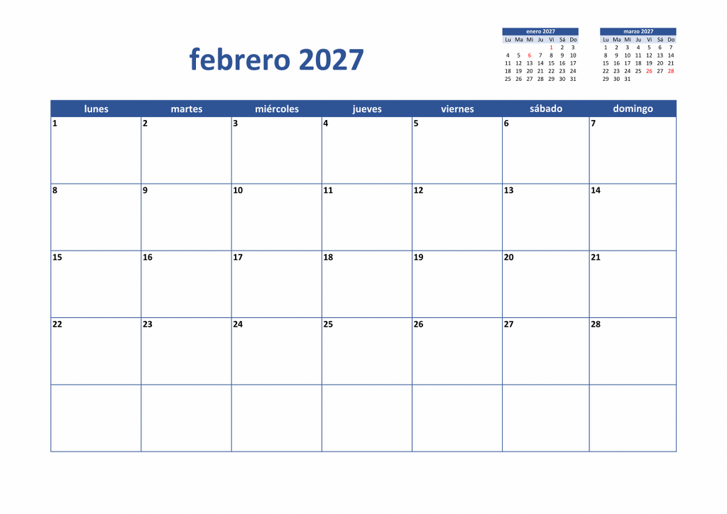 • Descargar Calendario Febrero 2027 con los días festivos como MS Word, PDF y JPG en formato A4.