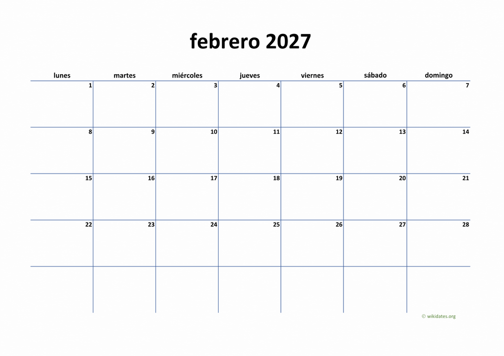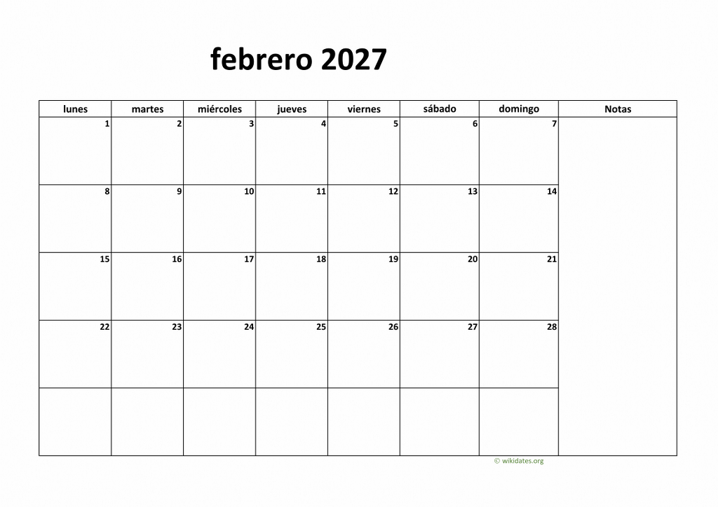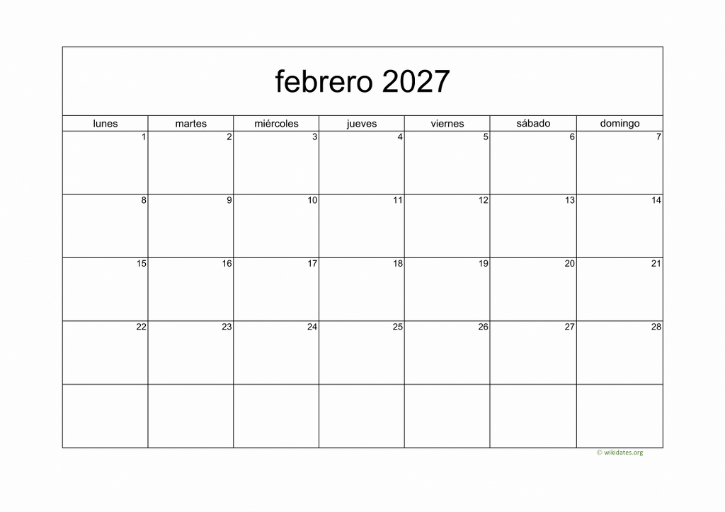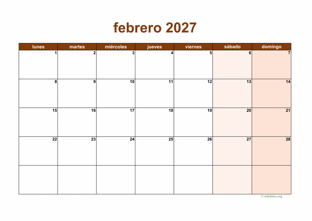 • Calendario Febrero 2027 con los días festivos, gratis, para imprimir.