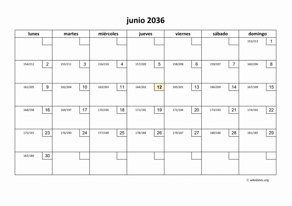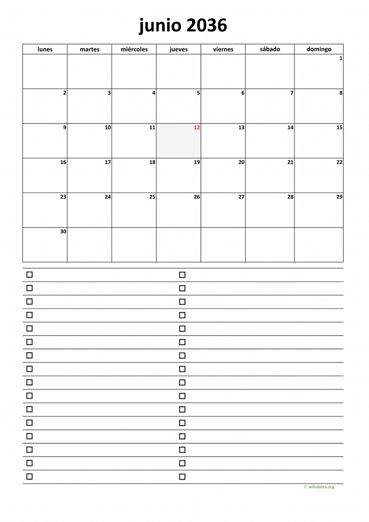 • Todo el calendario de junio de 2036 plantillas se pueden descargar, editar y gratuito para uso personal no comercial. Previsualizar y descargar todas las plantillas de calendario para imprimir en casa o en el trabajo.