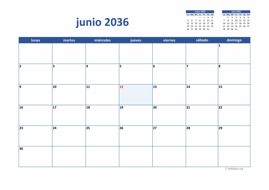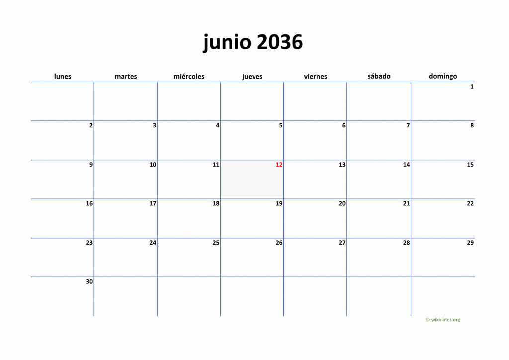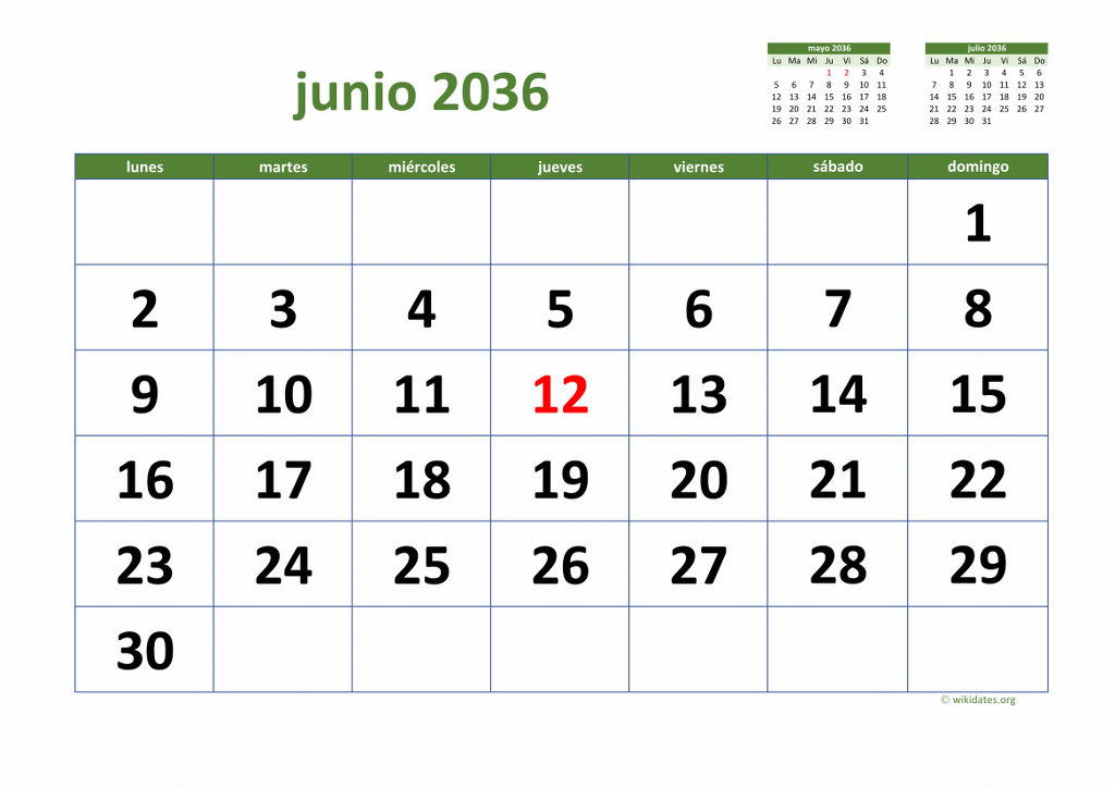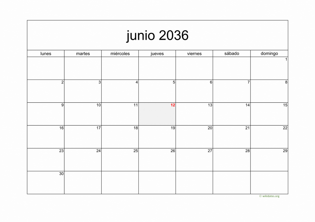 • Calendario Junio 2036 con los días festivos, gratis, para imprimir.