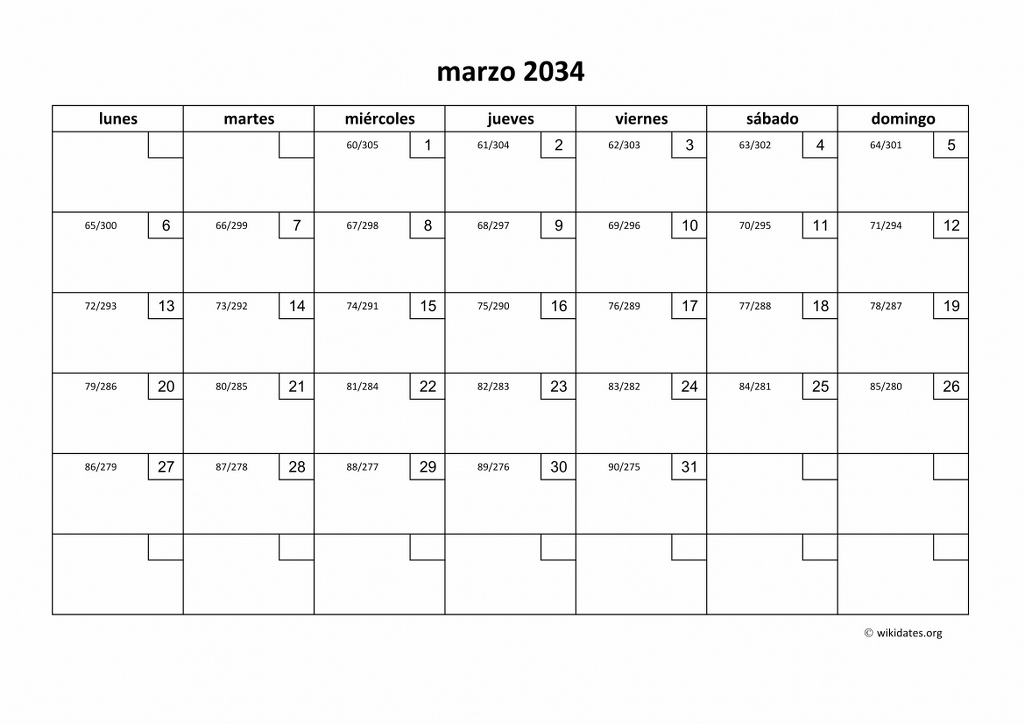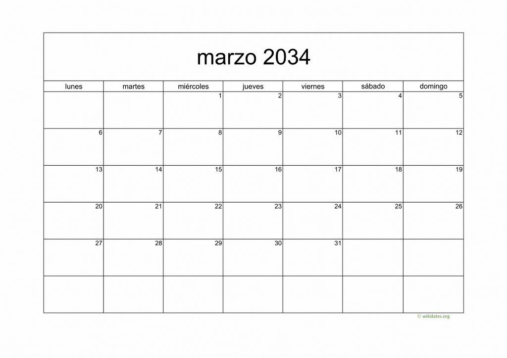 • Descargar Calendario Marzo 2034 con los días festivos como MS Word, PDF y JPG en formato A4.
