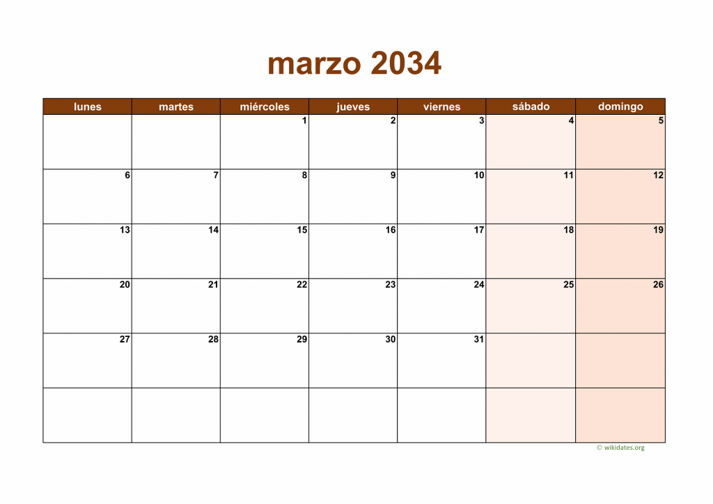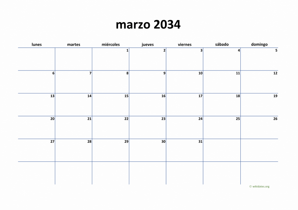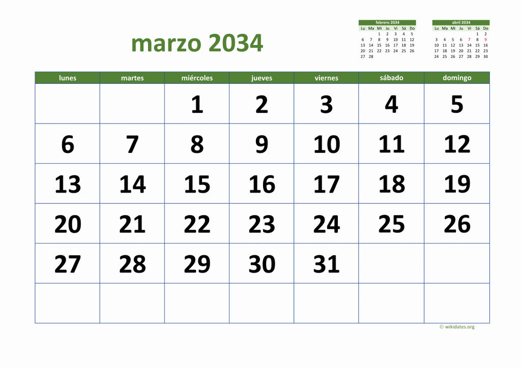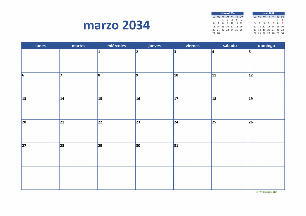 • Calendario Marzo 2034 con los días festivos, gratis, para imprimir.