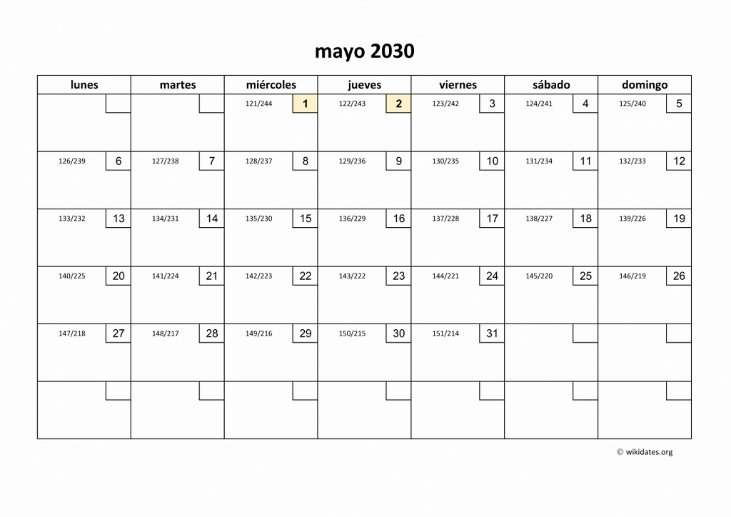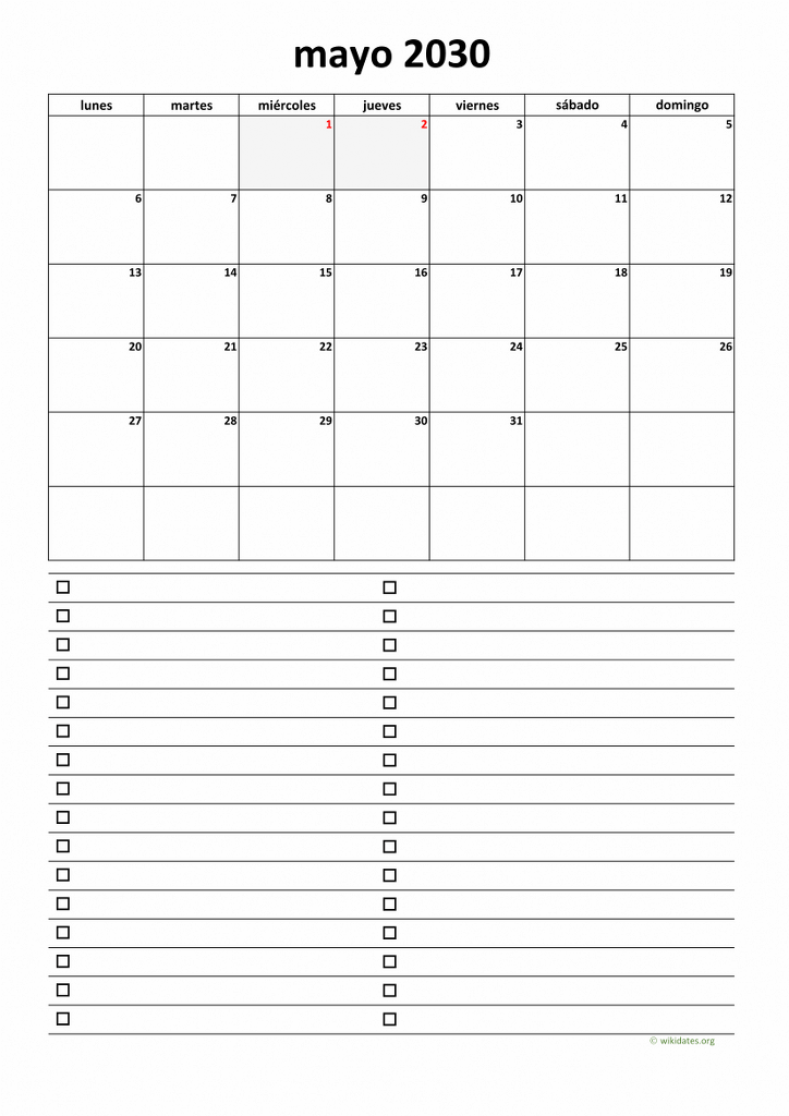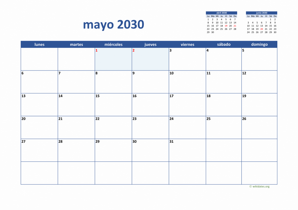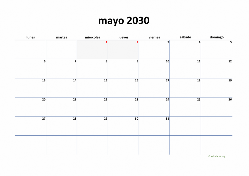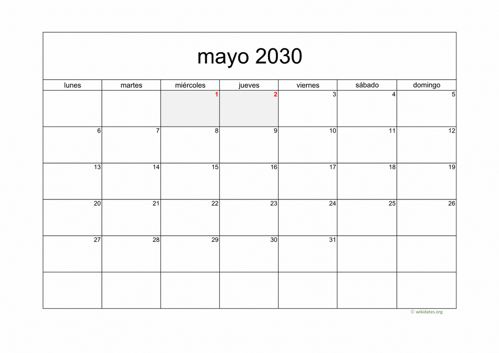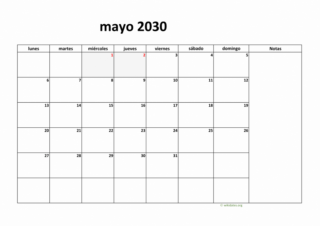 • Descargar Calendario Mayo 2030 con los días festivos como MS Word, PDF y JPG en formato A4.