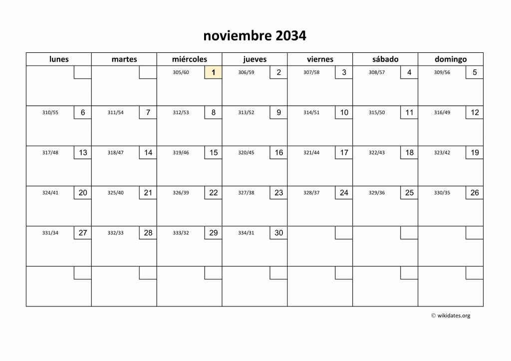 • Descargar Calendario Noviembre 2034 con los días festivos como MS Word, PDF y JPG en formato A4.