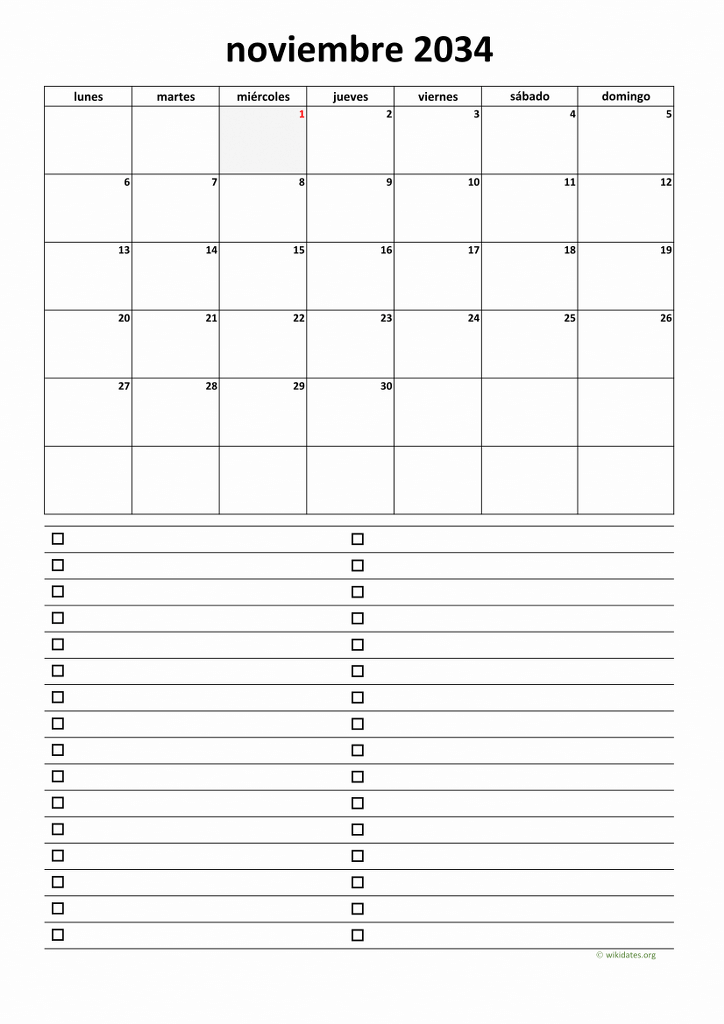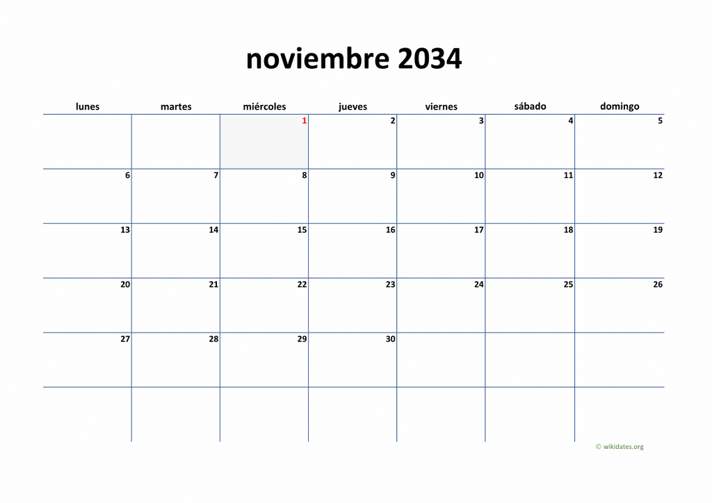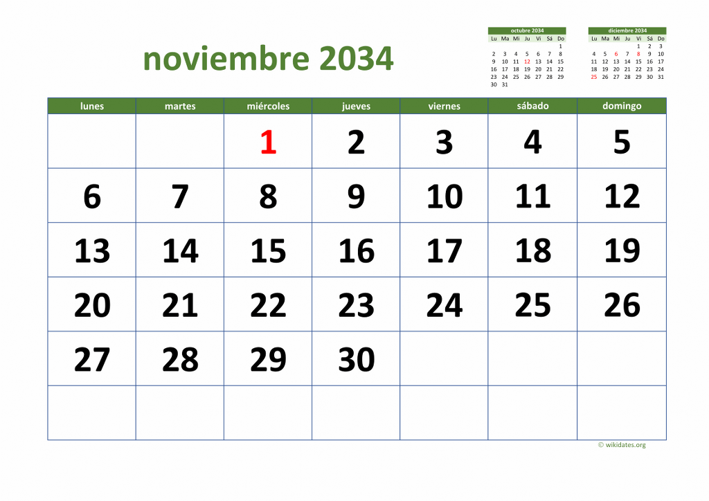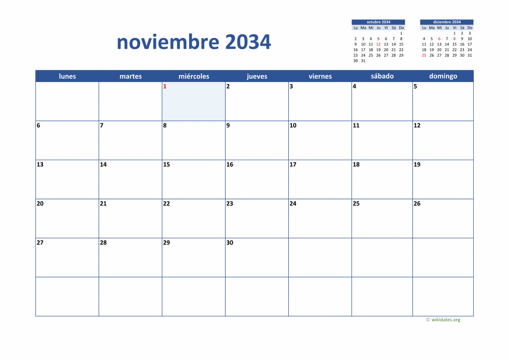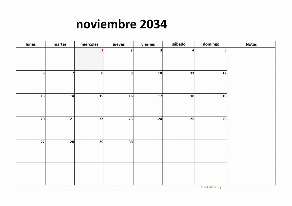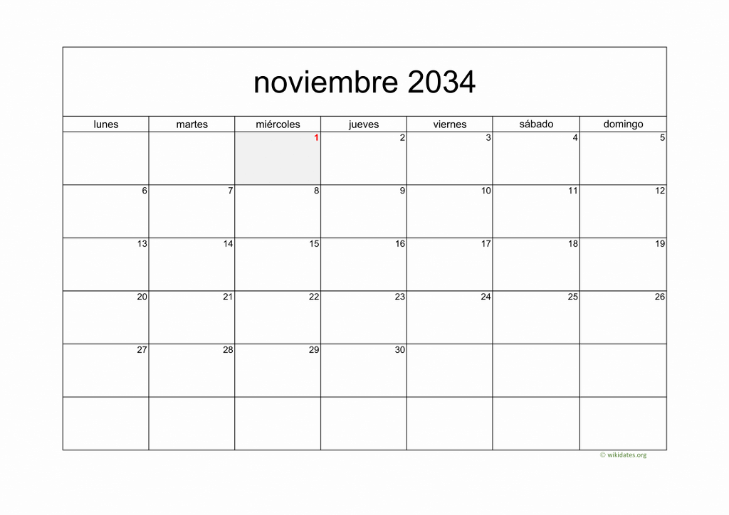 • Calendario Noviembre 2034 con los días festivos, gratis, para imprimir.