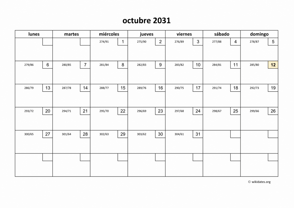 • Todo el calendario de octubre de 2031 plantillas se pueden descargar, editar y gratuito para uso personal no comercial. Previsualizar y descargar todas las plantillas de calendario para imprimir en casa o en el trabajo.