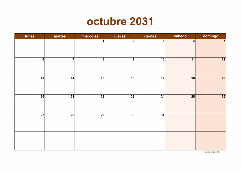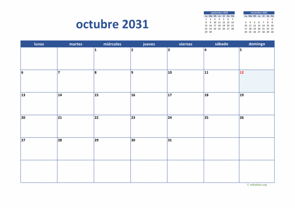 • Descargar Calendario Octubre 2031 con los días festivos como MS Word, PDF y JPG en formato A4.