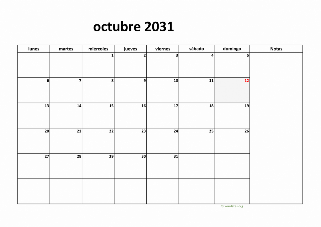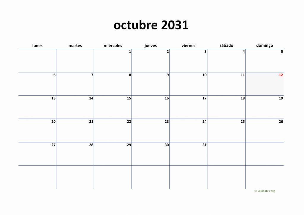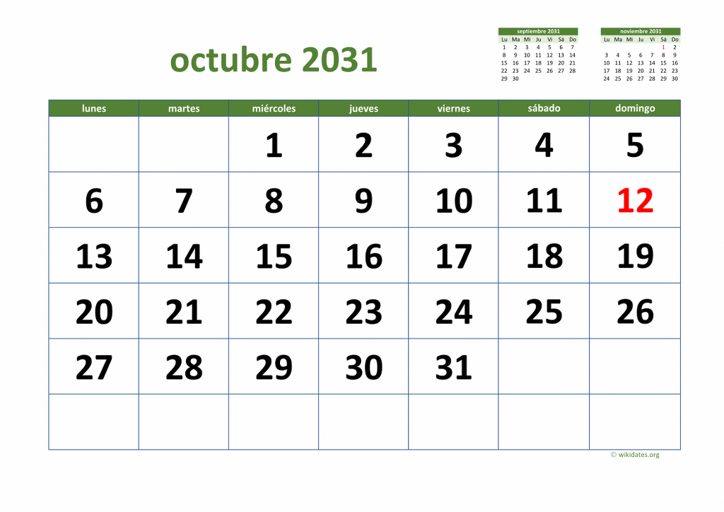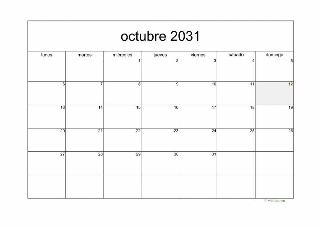 • Calendario Octubre 2031 con los días festivos, gratis, para imprimir.
